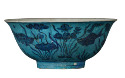 孔雀蓝釉青花鱼藻纹碗
