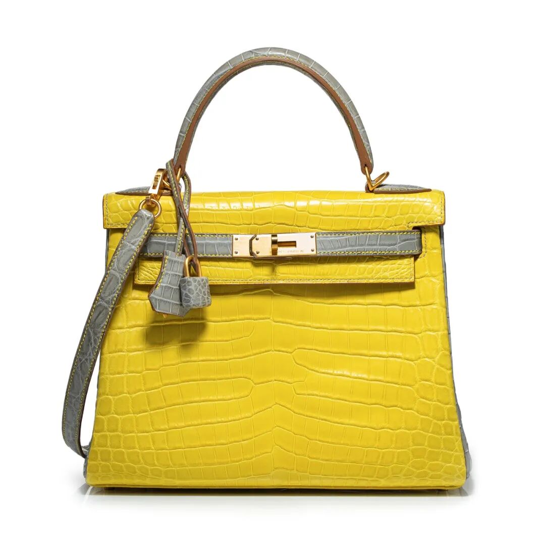 特別訂製霧面金盞花黃及珍珠灰雙色尼羅鱷魚皮28公分內縫凱莉包