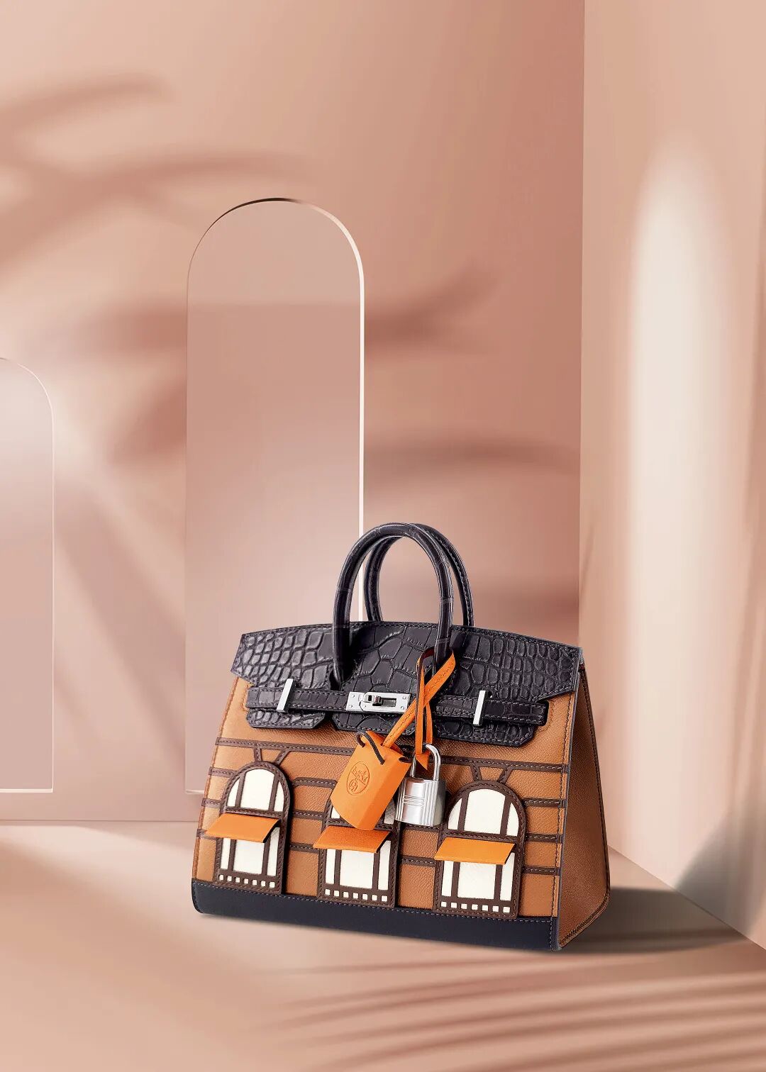 手袋由多種名貴的皮革手工縫製出總店的外形,包括大樓的門面及櫥窗,甚至立體設計的簷篷細節,極為精細。手袋的掛件也特別改造成一個愛馬仕標誌性的迷你橙色購物袋,每一處的細節都令人驚喜讚嘆。