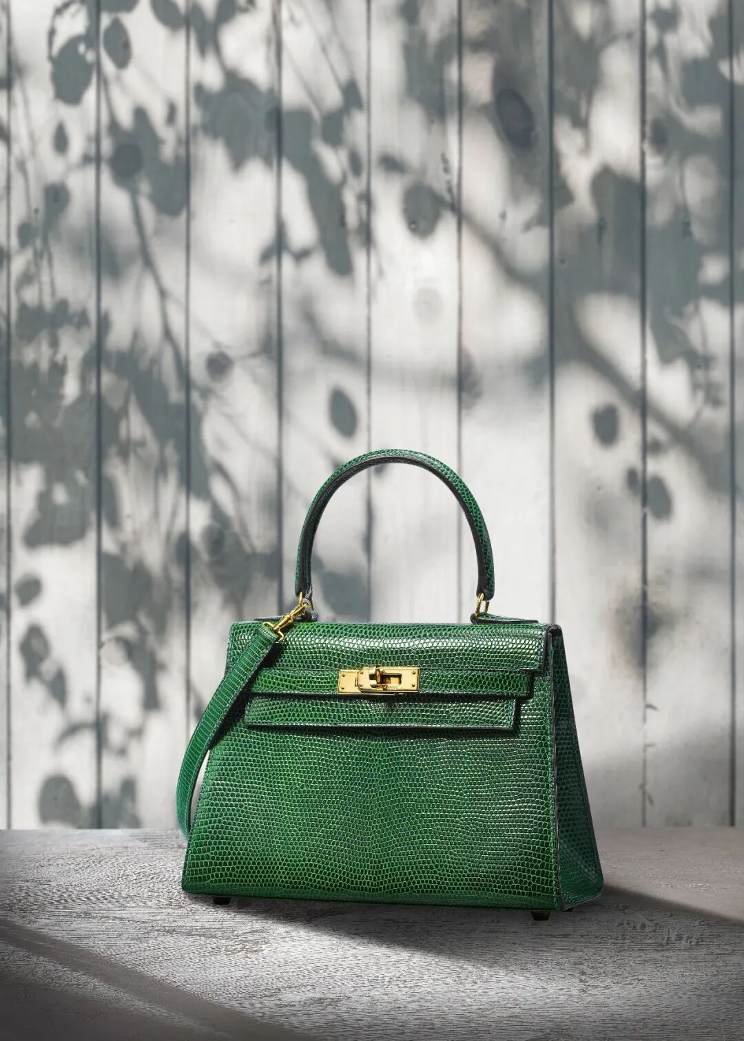 在愛馬仕的絢麗色譜裡,翡翠綠色為最富盛名的色彩之一,亦是極為稀有的顏色,通常用於鱷魚皮手袋上。翡翠綠色的亮面蜥蜴皮手袋產量比鱷魚皮更為稀少,使這個品相極佳的迷你凱莉手袋更為稀有。