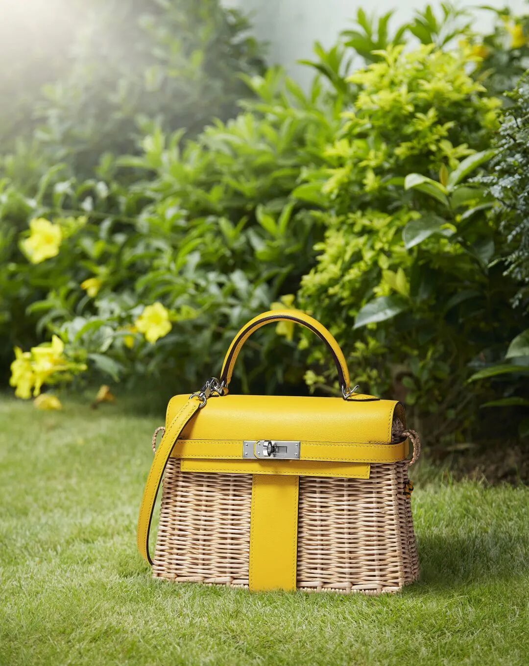 限量版那不勒斯黄色SWIFT小牛皮及柳條迷你野餐凱莉包附銀色金屬配件