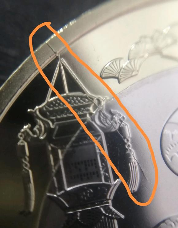 从网友晒图我们可以看到,在虎年纪念币背面的花灯上方,有一条凸起的线,网友们说这是“模裂”。