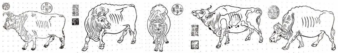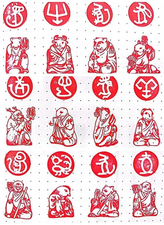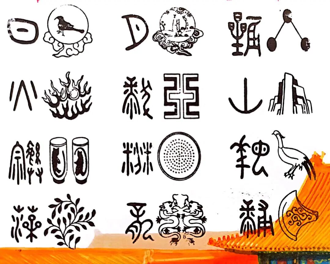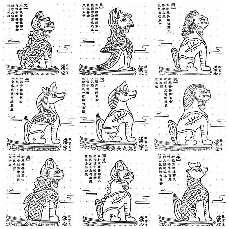 !ps:盖章打卡一定要穿双舒适的平底鞋,册子很重,最好背个包~馆内有好几组套章做的非常精致,有“九龙壁”“十二生肖及甲骨文”等,小编最喜欢的“太和殿脊兽”套章,可以看清楚每一个神兽的样子以及它们各自的本领。你可以在这里买一本《花下动香风》笔记本,“拿下”所有的章。馆内有人负责现场盖章,有时需要排队。拟人化的十二生肖和它们对应的甲骨文(这个很汉字馆)