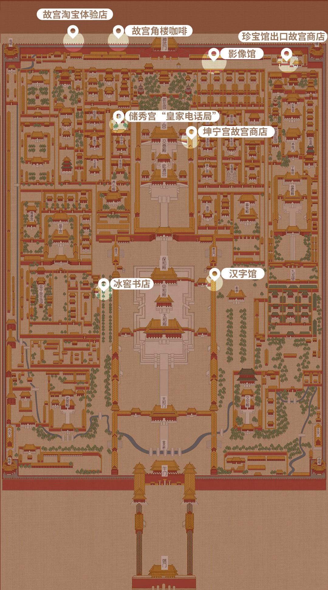 太和殿脊兽中最后的“行什”,十个兄弟姐妹缺一不可朱瞻基画的《武侯高卧图》,竹林下,袒胸露乳的是诸葛亮中间这头牛表情显得很迷茫…旁边是乾隆的“古稀天子”宝必盖章:《千里江山图》《韩熙载夜宴图》《兰亭修禊图》小编攻略:走到故宫北出口神武门的位置,千万别出门,在它的东侧还有一排文创店,这其中就有影像馆。这里的章大多和故宫珍藏古画有关,像《兰亭修禊图》《韩熙载夜宴图》等,更有故宫唯一的一枚《千里江山图》的印章,很多人都为了这个章来打卡。影像馆的章不多,买一个《冰嬉》的笔记本就可以全部拿下。必盖章:“皇家电话局”、“北京中轴线”、“紫禁城里过大年”系列小编攻略:这里可是故宫盖章人气最高的地方(没有之一),如果来这里,一定要做好排队等候的准备。印章的类型比较齐全,特别是为传统节日设计的章,都很用心。像“紫禁城里过大年”系列的章,这里最多,有门神、财神、宫灯等等。人少的时候,这里的店员,还会边盖章,边向你介绍每一个章的文化内涵哦。慈禧50岁大寿时,曾大修储秀宫,建筑中加入了大量的“福寿”元素皇家电话局,曾是清政府钦准的中国第一个官方部办京城电话局2005年在故宫储秀宫绥福殿再次"开业"必盖章:“十二章”纹样及宗彝、虎年贺岁章、《冰嬉图》小编攻略:书店里的章什么样呢?文邹邹的,特别用心!像吉祥八宝、祥瑞紫禁城等等,花纹繁复,寓意美好,只有冰窖书店才有。你还记得今年《2022故宫日历》封面的那只“大老虎”吗,这里也有它的印章,盖上就相当于留下了虎年的记忆。不知道印章的含义,可以请教书店里工作的伙伴,都很和气,还可以翻阅书店里相关的书籍。“十二章”纹样中的宗彝:一只虎﹑一只蜼(wěi ,长尾猿)虎年特别章:清宫服饰“虎佑平安”、飞虎旗“佩虎纳福”小编攻略:这个地方有点难找,就在坤宁宫东侧的角落里,免费的章就摆放在室外。这里最大的特点就是“古建筑”题材的章,比如“太和殿”“乾清宫”“交泰殿”等,光“角楼”的章就有三种。你可以在这里买一本《千里江山图》的笔记本,包含了全部32个印章,是已经盖好的。你也可以购买其它的小册子,让店员现场给你盖。慈禧书“福禄寿”,字画结合,三个字组合成一个拄着拐杖的老寿星慈禧书“永天庆”,光绪御笔“与福相迎”,慈禧书“含和履中”必盖章:“御猫”写实版、“玉兔捣药”、“故宫展览”系列小编攻略:这个地方比较难找,就在珍宝馆的北出口,沿着影像馆这侧的文创店一直往东走也能找到。这里的章类型也很多,仅次于皇家电话局和冰窖书店,跟展览相关的章是这里的特色,有“故宫600年”“苏东坡大展”的周边章,也有“故宫邮票展”“故宫法器展”“故宫敦煌特展”的周边章,“故宫敦煌特展”系列的飞天都美爆了!另外御猫章和“玉兔捣药”是这里的网红章!推荐你买一本《洛神赋图》,可以拿下了70多个章。
