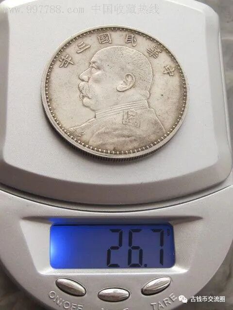 根据《国币条例》的规定,真品袁大头壹圆的标准重量为“七钱二分”,即和清代光绪元宝和大清银币同重,即27克,成色88%。但是经过正常的银元经过流通磨损后,其重量大多在26.6g-26.9g之间,一般不低于26g,不高于27g,如果不符合标准就极有可能是赝品。这种方式可把真银假币以外的假币全pass掉。![]()