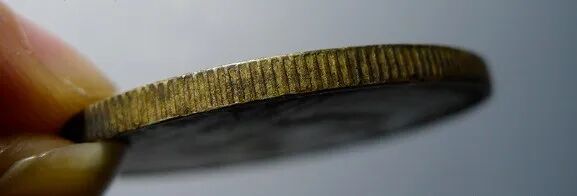 而假币的币面图案和边齿是分别压制的,所以会存在币边毛刺、边齿与币面交角不自然等情况。
