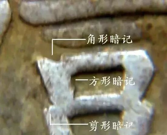 在汉字上采用某种图形作暗记,例如:一些“三角圆”银币的“壹”字上设有,剪形、角形、方形等缺口图形。