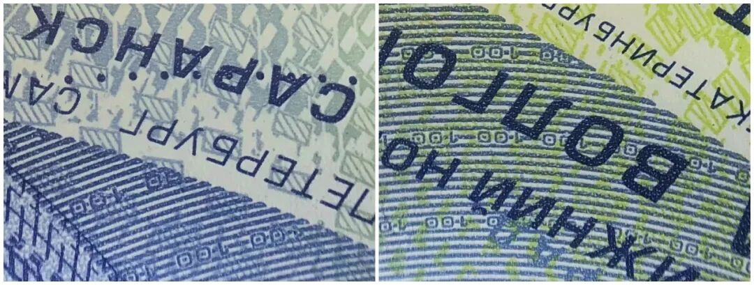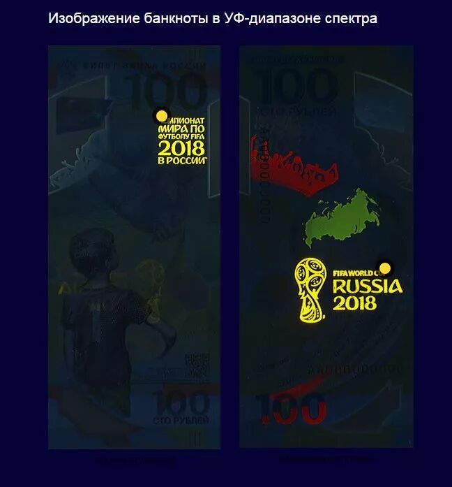 正面底部印有一个二维码,扫一扫即可访问俄罗斯央行官网,查看纪念钞的防伪特性。背面图案:是一个程式化足球形状的地球仪图像,其中用彩色图像概述了俄罗斯联邦的领土。足球上方,以俄罗斯国旗三色,勾勒出球迷欢呼呐喊的剪影,下方则列举了本次世界杯的各个举办城市。光变油墨技术:转动钞票,小男孩手里的足球还会变颜色,在蓝色和绿色之间切换,非常漂亮;▲倾斜时,足球片状颜色蓝绿变换。