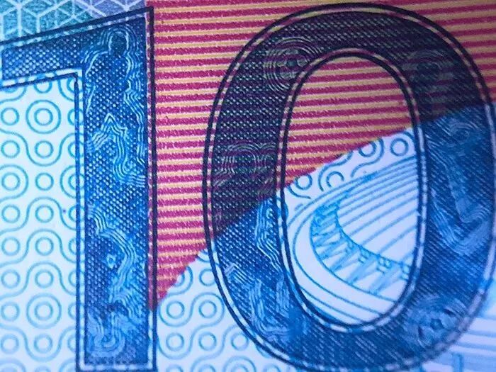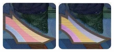 小男孩下方左下角处采用了安全多色底物印刷,倾斜时可见条带的颜色变化:蓝、红、黄——紫、黄、蓝。