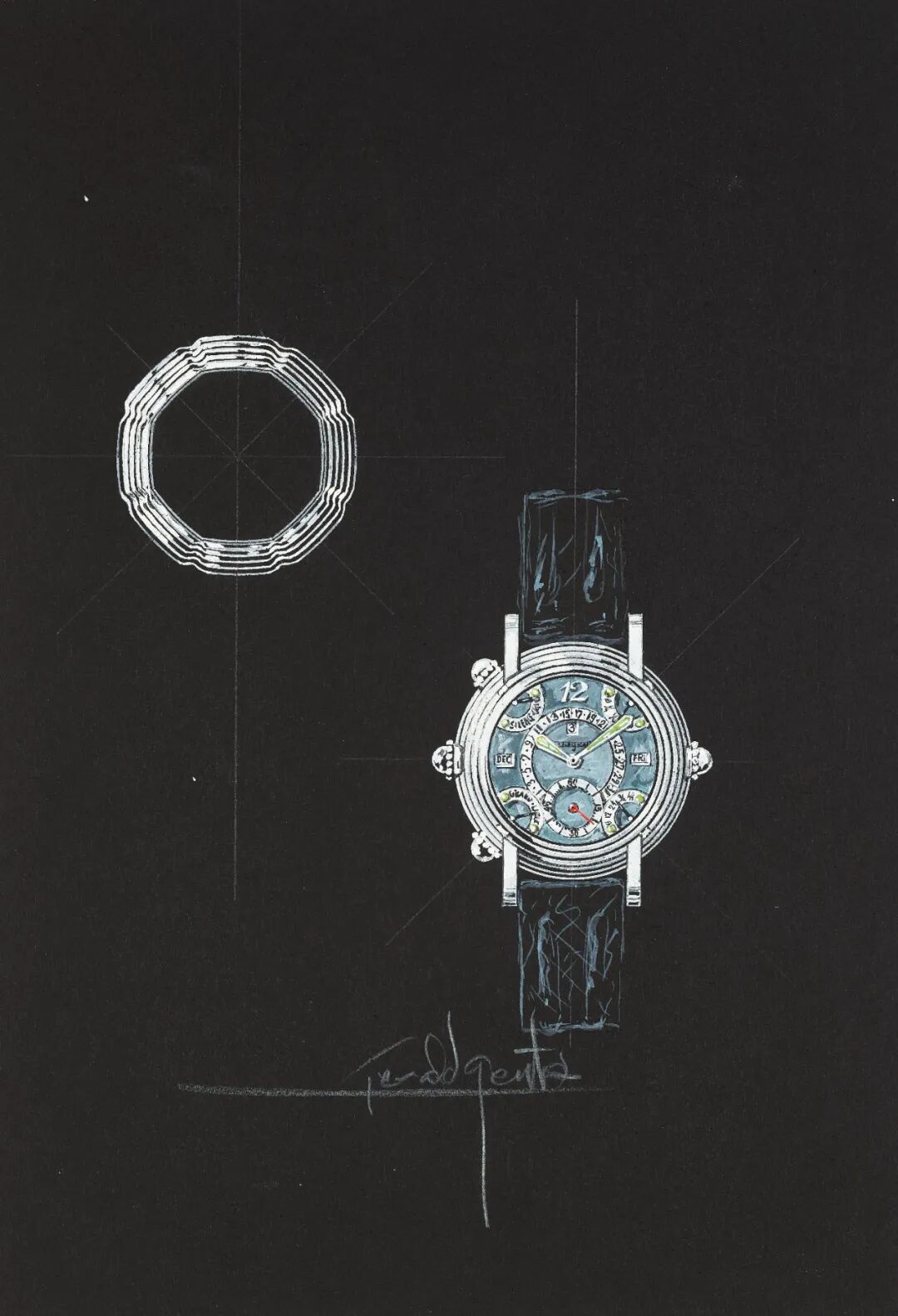 经过5年的研发后,杰洛.尊达于1995年发布Grande Sonnerie (大自鸣)这款当时世上最复杂精巧的腕表。Grande Sonnerie腕表可谓尊达对制表工艺最重要的贡献,而它为制表界开拓了众多先例,包括模仿伦敦大笨钟的报时声响,内有超过1,000个部件。Grand Sonnerie腕表配备三问报时、模仿西敏寺钟声的四组音簧音锤、万年历、两个动力储存显示等多种功能,令它成为钟表工艺界无与伦比的传世经典。在这款腕表面世前,几乎只有怀表才会具备大自鸣功能。尊达当时合共制作了20款独一无二的Grande Sonnerie腕表,而是次拍卖将呈献其中3款大自鸣的设计图。