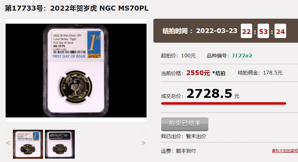 昨天晚上,在某拍卖网站上,一枚NGC MS70PL的虎年纪念币,以2728.5元成交,就是下面这枚。