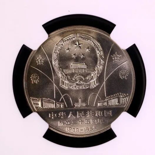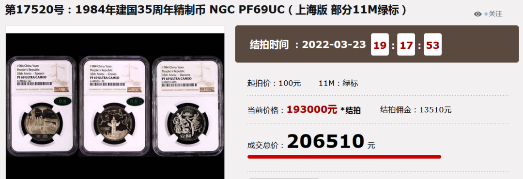 建国35周年精制币 NGC PF69UC(上海版 部分11M绿标),试铸样币,206510元成交。相较去年秋拍,增幅18%。同时建国35周年半精制币-大典 NGC MS69(上海版),12198元成交,创造历史最高价格。建国35周年精制币沈阳版 NGC PF68UC多币封装,7552元成交。