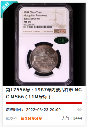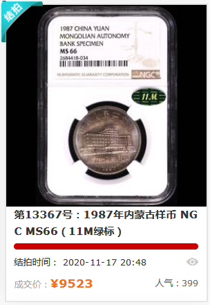 再看看内蒙样币,NGC MS66 11M绿标,18939元成交。2020年11月份同品种同分数同绿标,成交价9533元。涨幅100%。