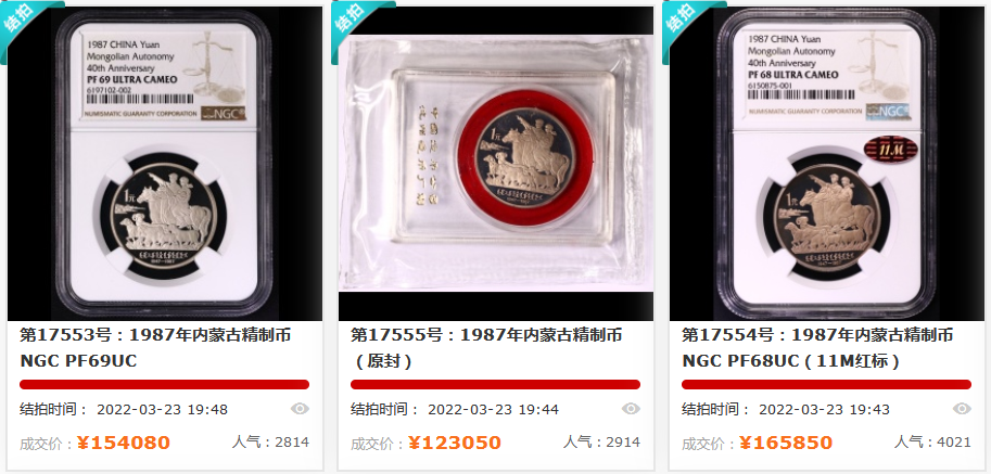 本次春拍,内蒙古精制币总计上拍3枚,既有冠军分数,又有炫彩包浆,还有原封原状态,总体成交价格稳定,满足不同藏者需求。
