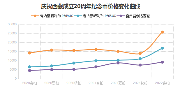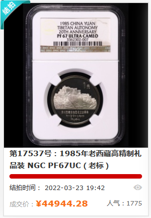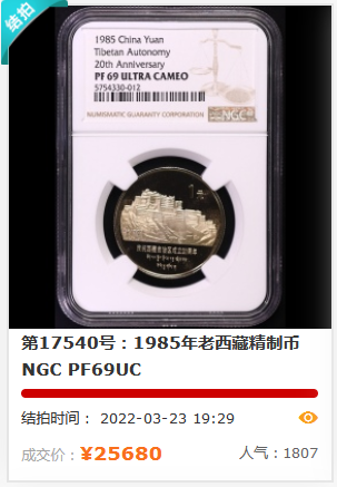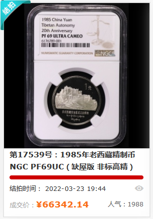 老西藏精制币 NGC PF69UC,非标高精,66342元成交。老西藏高精制礼品装 NGC PF67UC,44944元成交。老西藏精制币 NGC PF69UC,25680元成交。NGC PF68UC 16799元成交。值得一提的是,本次老西藏精制币上涨幅度明显,基本上本场68UC的价格等同于去年69UC的价格。直角普制老西藏 SP69,9095元成交。