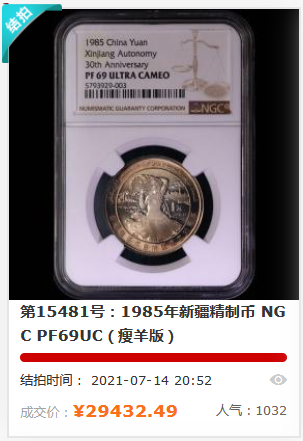 同时新疆样币 NGC MS67,29960元成交,也是网站最高成交价格。新疆普制币 NGC MS67 11M绿标,1927元成交。