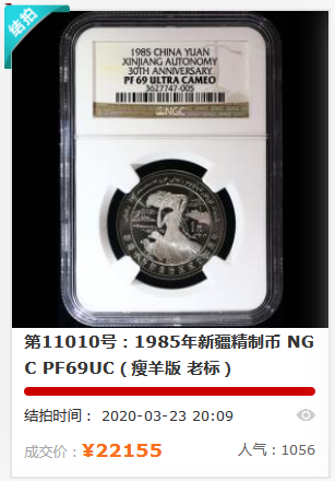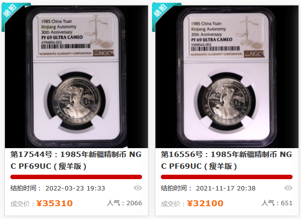 新疆精制币本次春拍仅有瘦羊版上拍,NGC PF69UC,35310元成交。从价格来说相较去年涨幅10%。并且对比几次往期大拍,基本每次涨幅都在10%上下,稳步上涨。