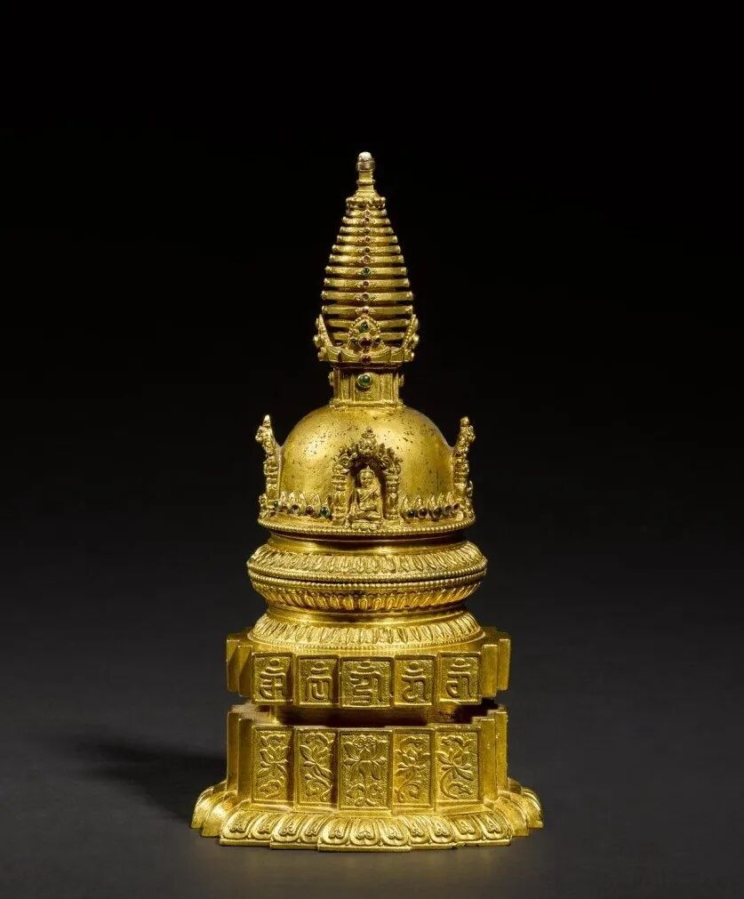 Lot 179 尼泊尔 十五世纪 鎏金铜合金嵌宝石佛塔