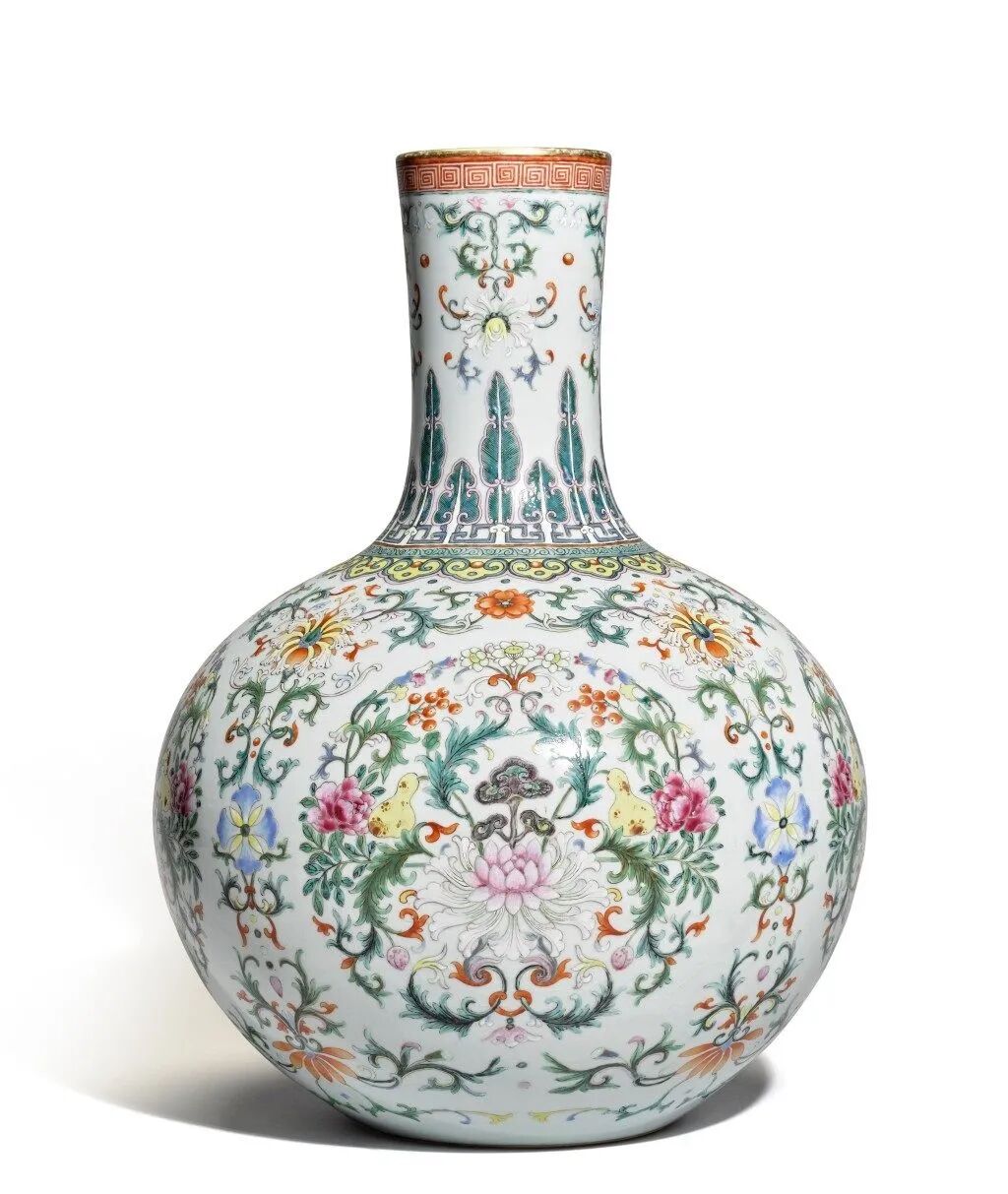 Lot 151 清乾隆 粉青地粉彩瑞芝番莲纹天球瓶