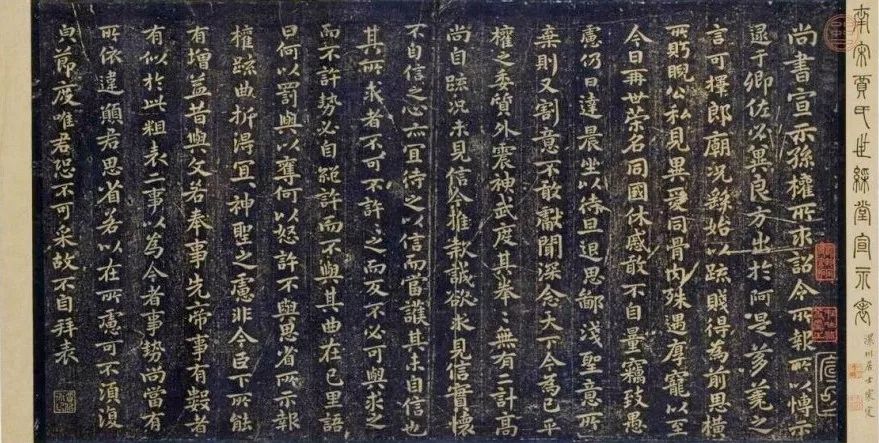 钟繇(151—230),字元常,世称“钟太傅”,颍川长社(今河南长葛东人),三国魏著名书法家。他所处的正是隶楷错变的时代,正如元袁裒《总论书家》所谓:“汉魏以降,书虽不同,大抵皆有分隶余风,故其体质高古。”因此在他的真书中也带有浓厚的隶意。他的小楷体势微扁,行间茂密,点画厚重,笔法清劲,醇古简静,富有一种自然质朴的意味。唐朝张怀瓘《书断》评曰:“真书古雅,道合神明,则元常第一。”又云:“元常真书绝妙,乃过于师,刚柔备焉。点画之间,多有异趣,可谓幽深无际,古雅有余,秦汉以来一人而已。”钟繇在书法上是下过苦功的,尝自称:“吾精思书学三十年,坐与入语,以指就座边数步之地书之,卧则书于寝具,具为之穿。”可见其矢志专一的学习态度。有一次,他在当时一个著名书家韦诞家中看见一篇蔡邕论笔法的文章,苦求不得,至于捶胸吐血,曹操即以五灵丹救之。及诞死后,繇阴发其冢,始得之,书遂大进,可见他对艺术的执著追求。其传世书作《贺捷表》、《宣示表》、《荐季直表》、《力命表》等,都是早期楷书的杰出代表。今天,我们所能见到的《宣示表》只有刻本,一般论者部认为是根据王羲之临本摹刻,始见于宋《淳化阁帖》,共18行。后世阁帖、单本多有翻刻,应以宋刻宋拓本为佳。此帖较钟繇其他作品,无论在笔法或结体上,都更显出一种较为成熟的楷书体态和气息,点画遒劲而显朴茂,字体宽博而多扁方,充分表现了魏晋时代正走向成熟的楷书的艺术特征。此帖风格直接影响了二王小楷面貌的形成。