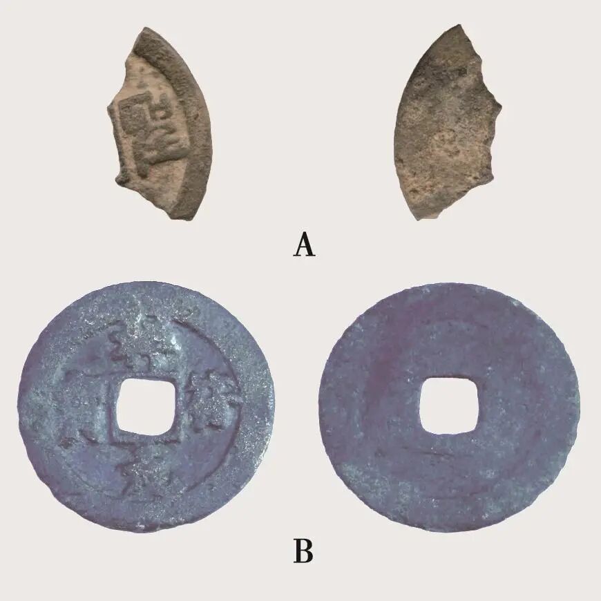 铜钱A,残存四分之一,直径25mm,厚2mm。方孔右侧为汉字篆书“圣”字。宋代铜钱上有“圣”字的有三种:圣宋元宝、天圣元宝、绍圣元宝。显然应该排除圣宋元宝,因为圣宋元宝的“圣”字在方孔上方,与本铜钱不符。天圣元宝发行于北宋仁宗天圣年间(1023~1032年),绍圣元宝发行于北宋哲宗绍圣年间(1094~1098年),形制皆有楷书、篆书两种。铜钱A的篆书“圣”字与天圣元宝、绍圣元宝都极为相似,因此两种可能性皆有。