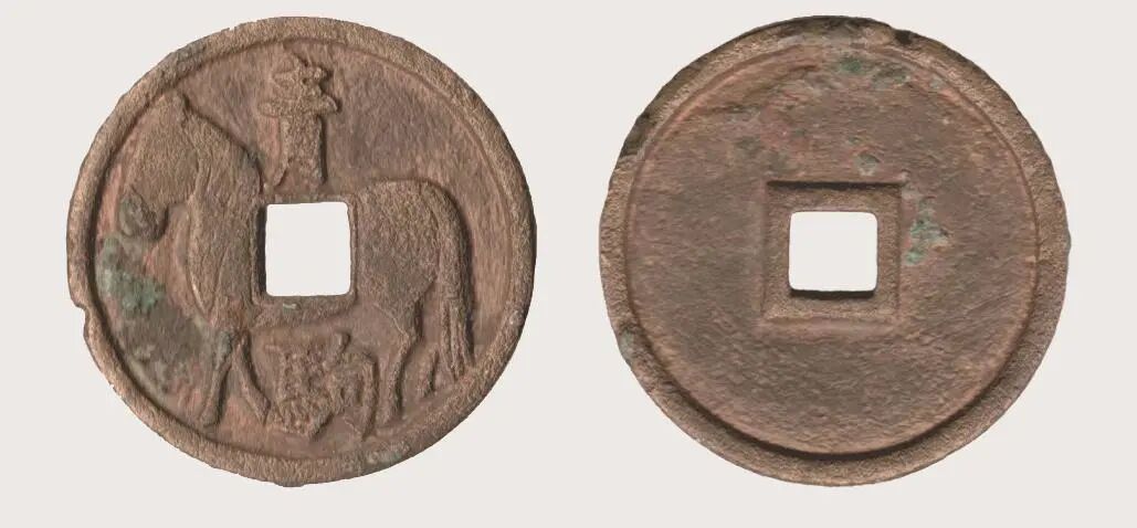 2000年,本文作者之一彼加列夫在发掘克拉斯诺亚尔斯克城址附近的马耶奇尼一号墓(Маячный бугор I)时,发现了一枚铜钱(图1)。铜钱直径28mm,厚2mm,方孔5×5mm。正面为一立马形象,方孔穿过马身正中,孔上为“青”字,孔下为“驹”字。钱背素面。