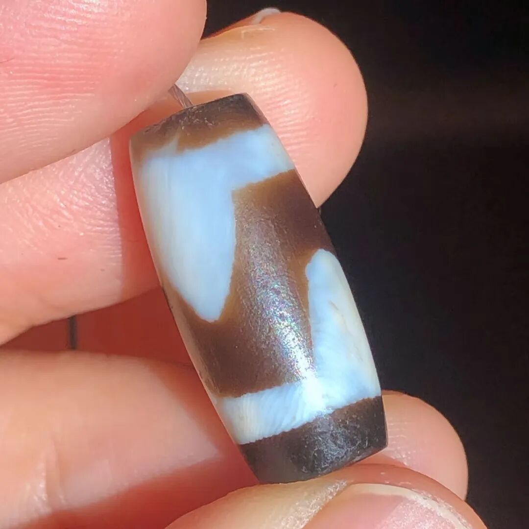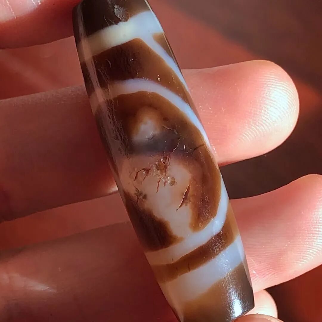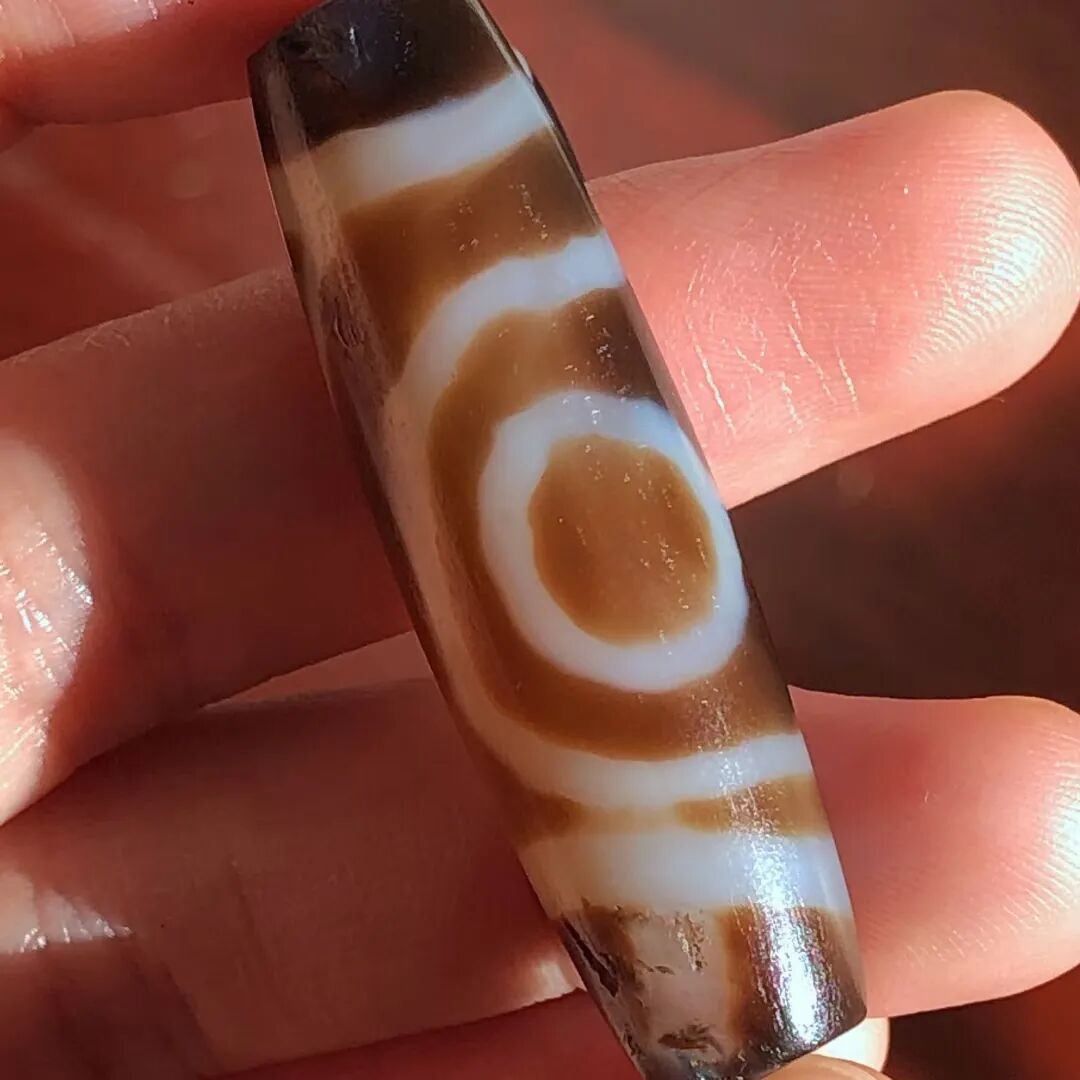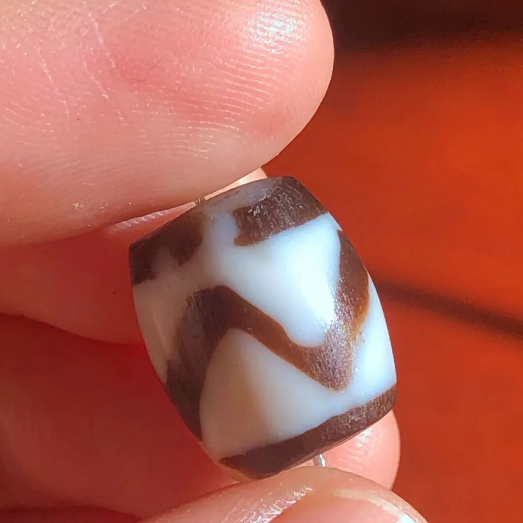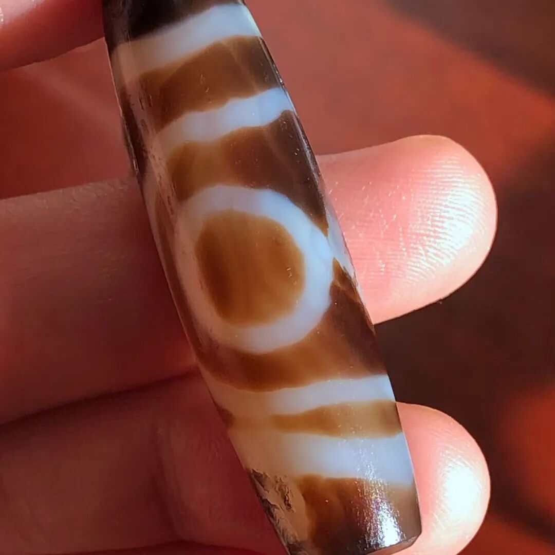 天珠(Dzi/Gzi):藏文音译近“思”多出现于喜马拉雅山周边地区,是在一定时期用特定的方法选择特定的原材料制作的带有类似眼睛和线条以及其他宗教图案的蚀花珠。先前学术界根据其工艺与视觉特征均以“蚀花玛瑙或者玉髓”为其命名,专业检激机构检测的样板报告中将其材质称为在“高温、高压”下形成的质点排列不同于普通玛瑙玉髄的隐晶质矿物的一种,相比普通玛瑙玉髓,其矿物晶粒更为细小、细腻。