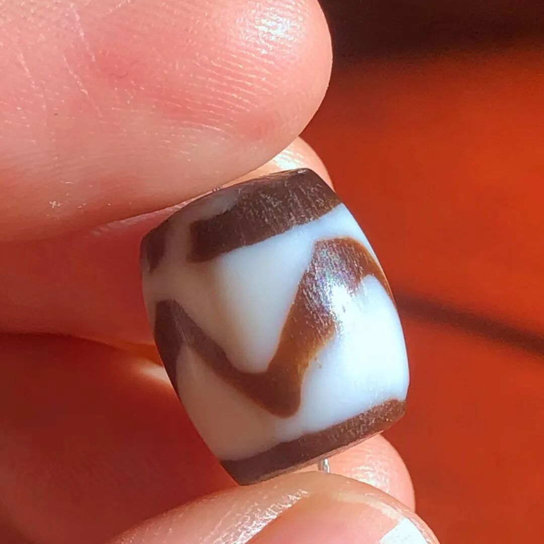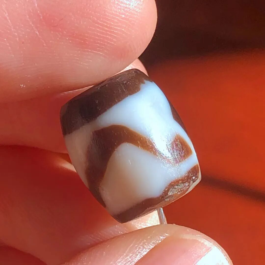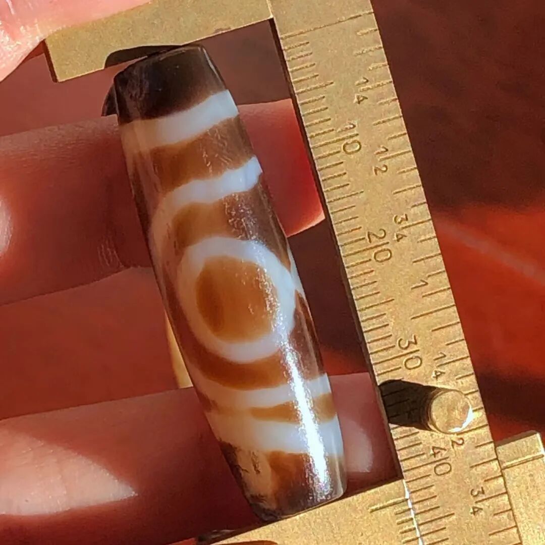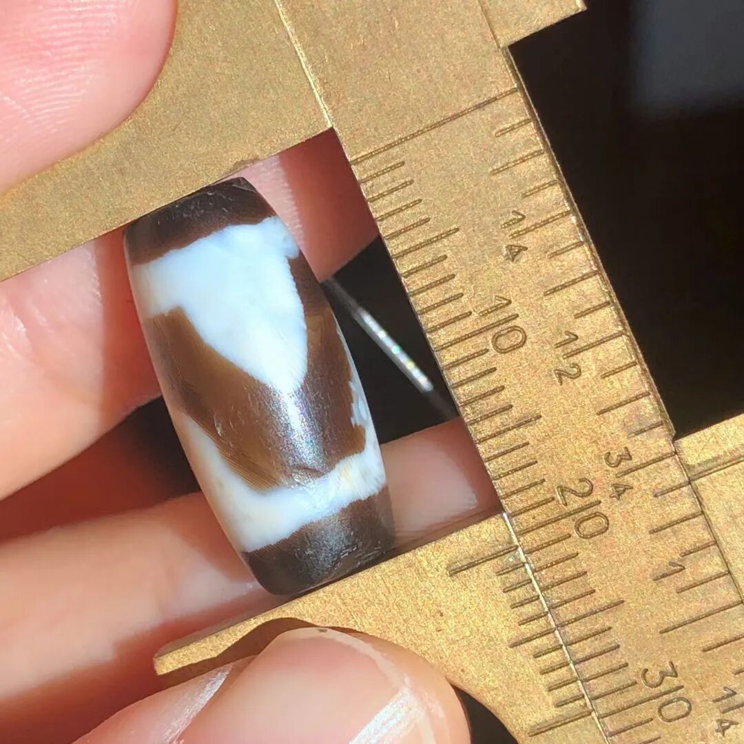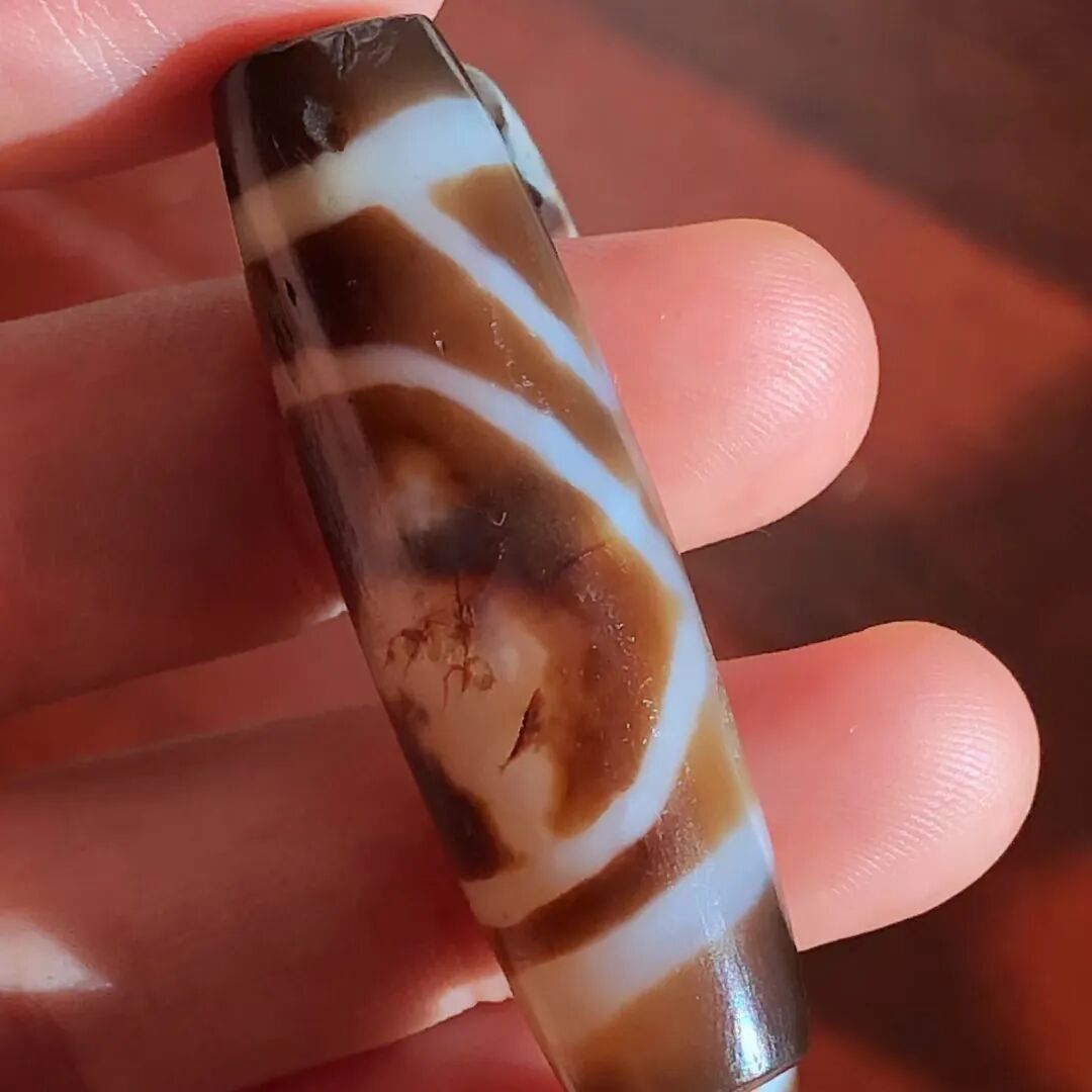 天珠(Dzi/Gzi):藏文音译近“思”多出现于喜马拉雅山周边地区,是在一定时期用特定的方法选择特定的原材料制作的带有类似眼睛和线条以及其他宗教图案的蚀花珠。先前学术界根据其工艺与视觉特征均以“蚀花玛瑙或者玉髓”为其命名,专业检激机构检测的样板报告中将其材质称为在“高温、高压”下形成的质点排列不同于普通玛瑙玉髄的隐晶质矿物的一种,相比普通玛瑙玉髓,其矿物晶粒更为细小、细腻。