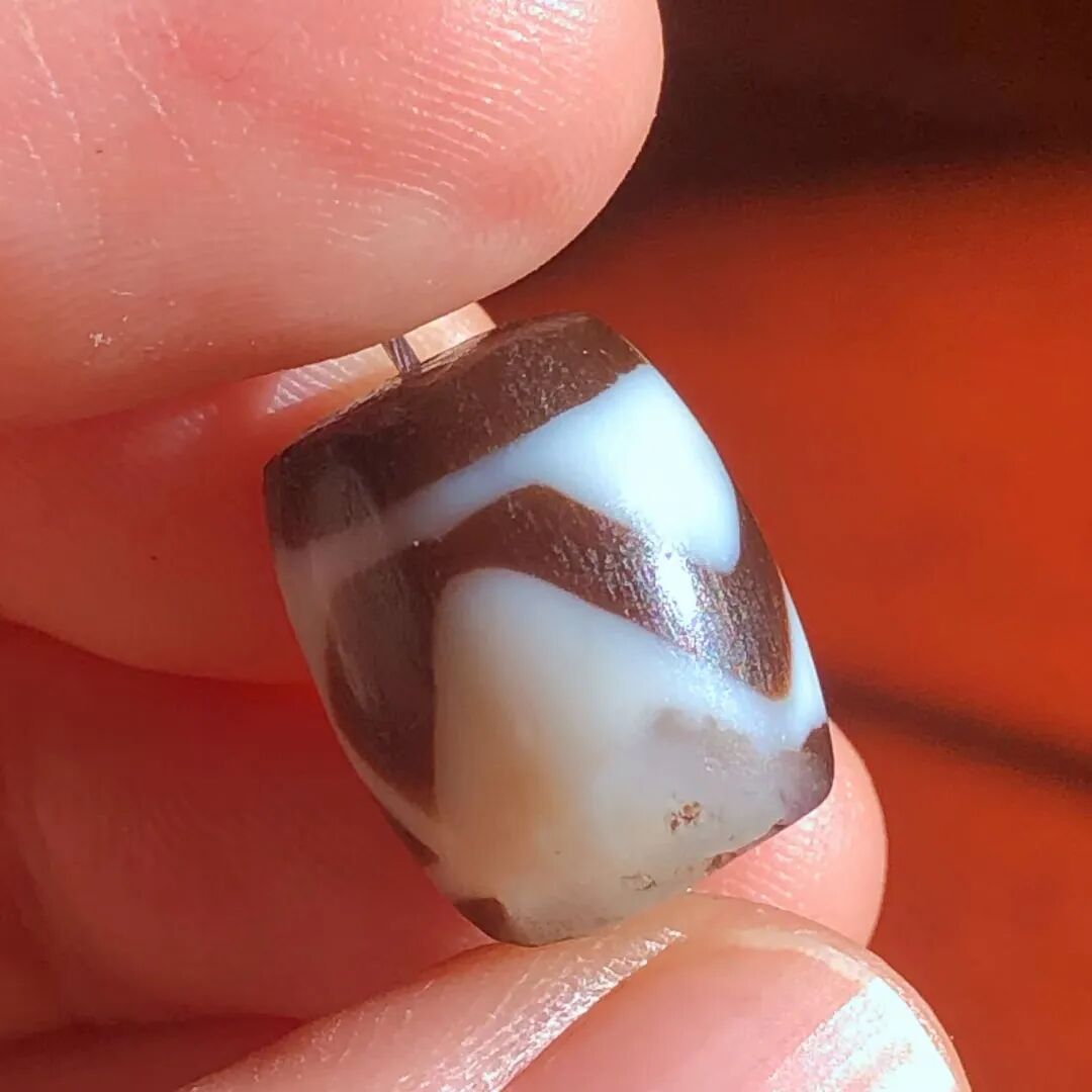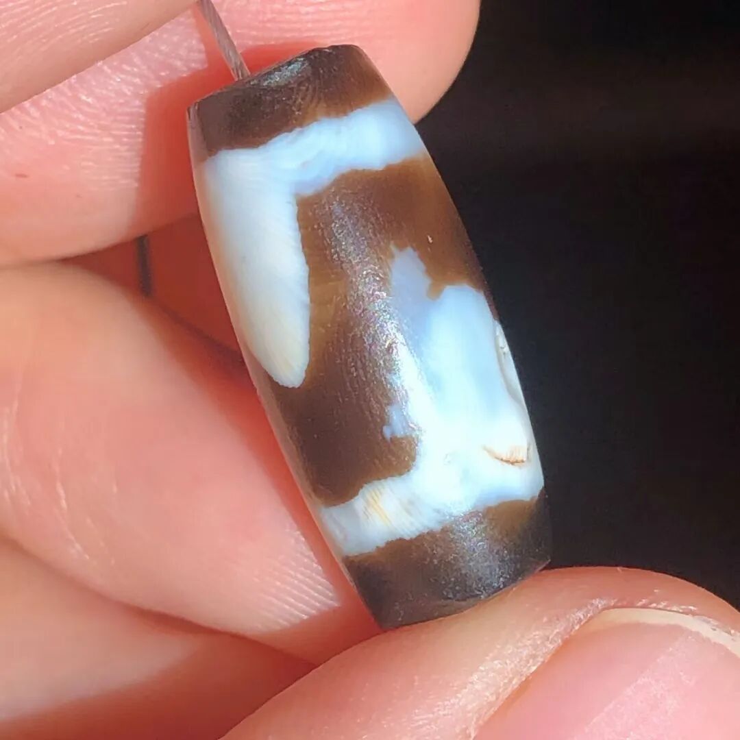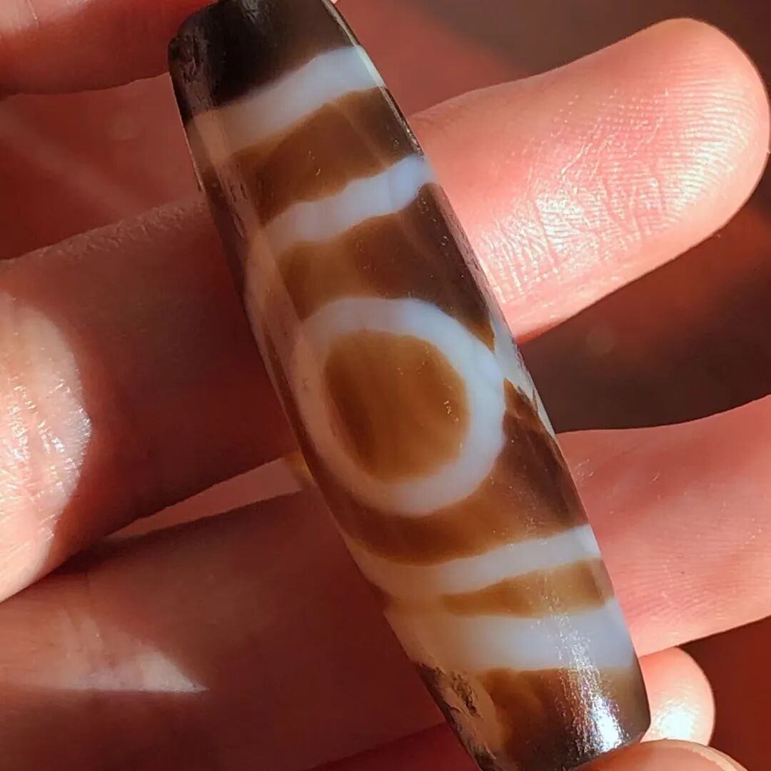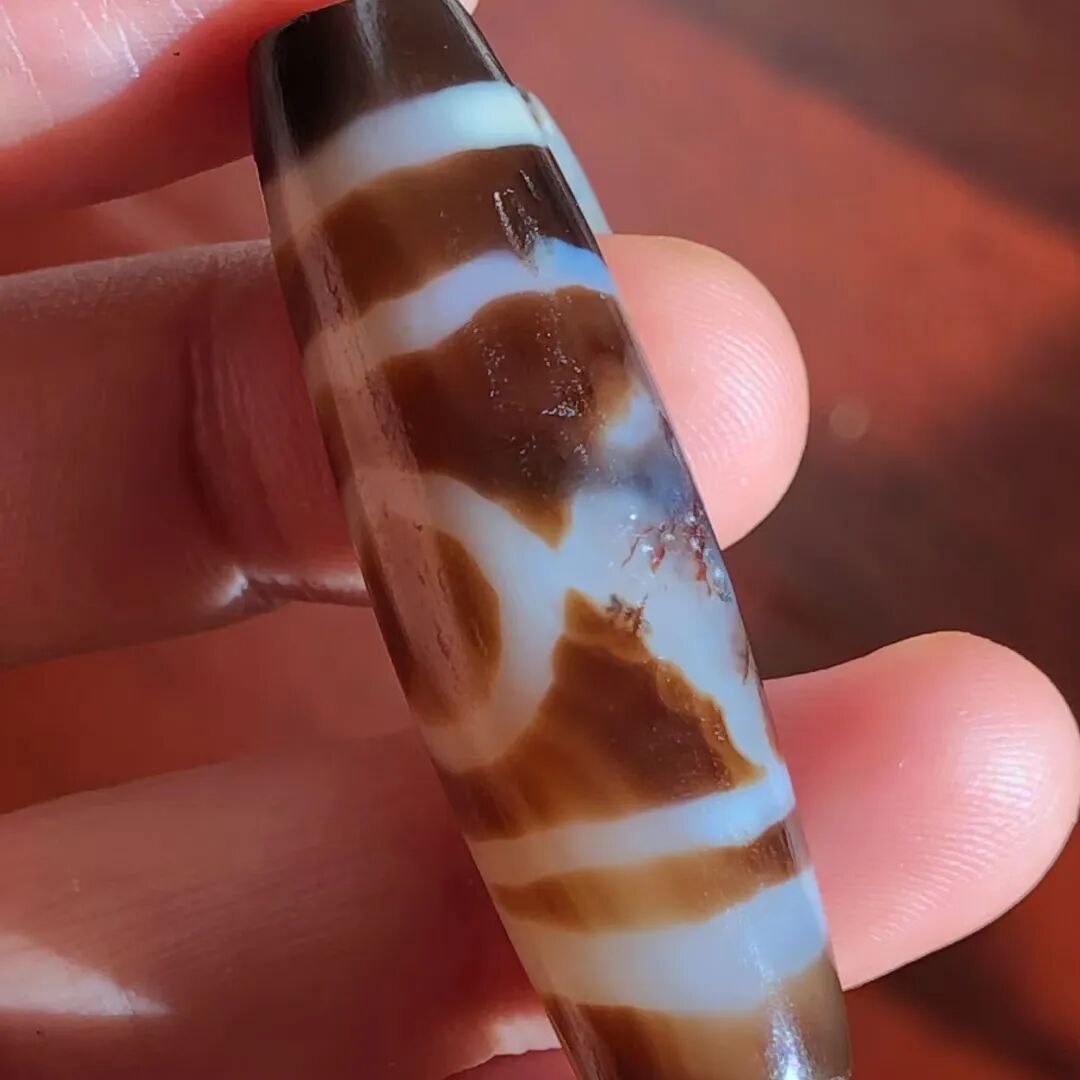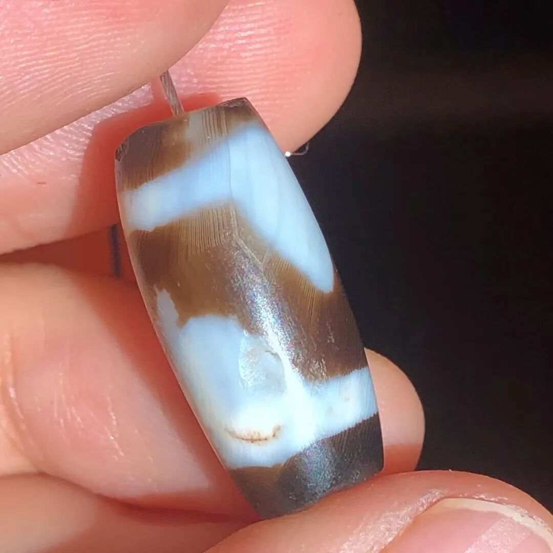 天珠(Dzi/Gzi):藏文音译近“思”多出现于喜马拉雅山周边地区,是在一定时期用特定的方法选择特定的原材料制作的带有类似眼睛和线条以及其他宗教图案的蚀花珠。先前学术界根据其工艺与视觉特征均以“蚀花玛瑙或者玉髓”为其命名,专业检激机构检测的样板报告中将其材质称为在“高温、高压”下形成的质点排列不同于普通玛瑙玉髄的隐晶质矿物的一种,相比普通玛瑙玉髓,其矿物晶粒更为细小、细腻。
