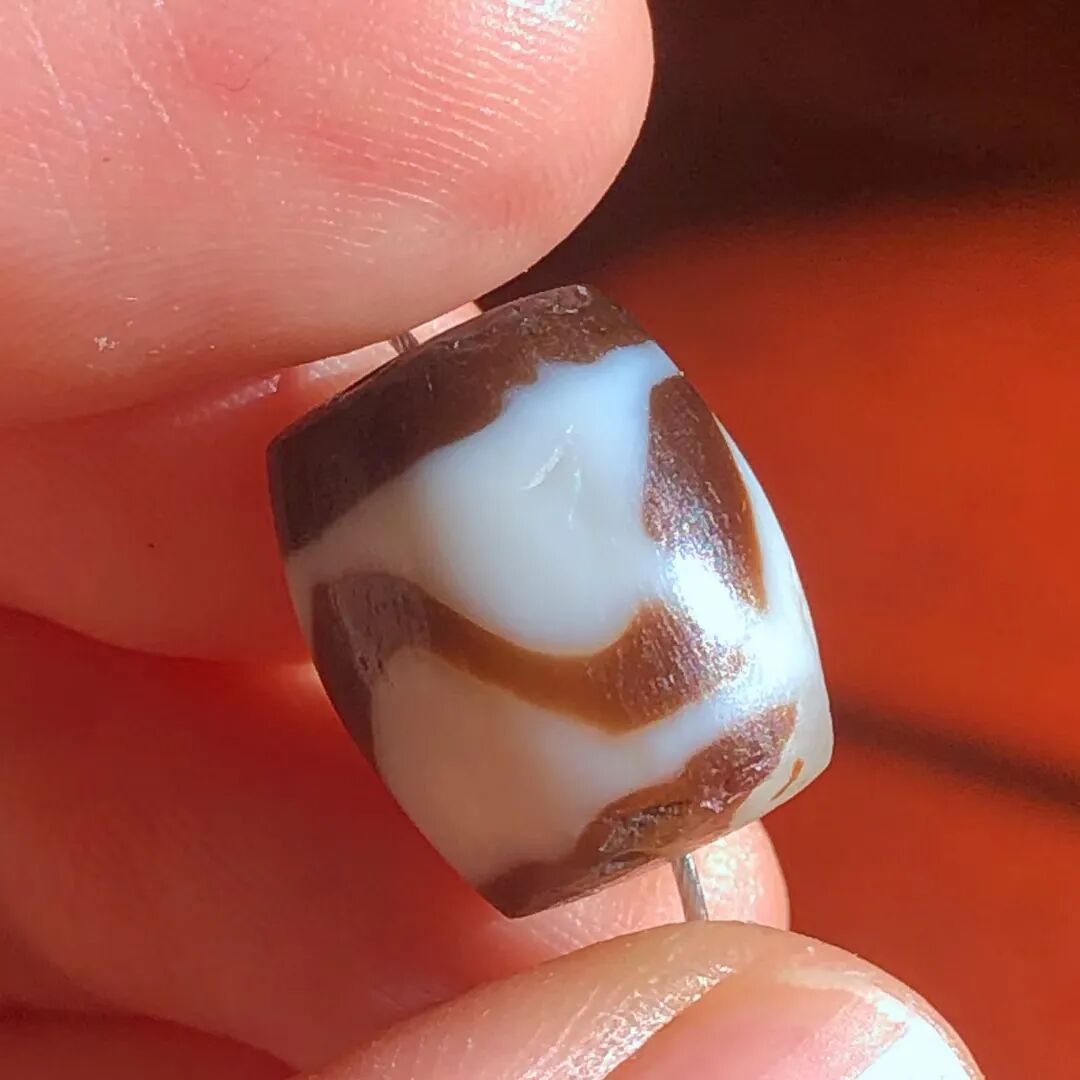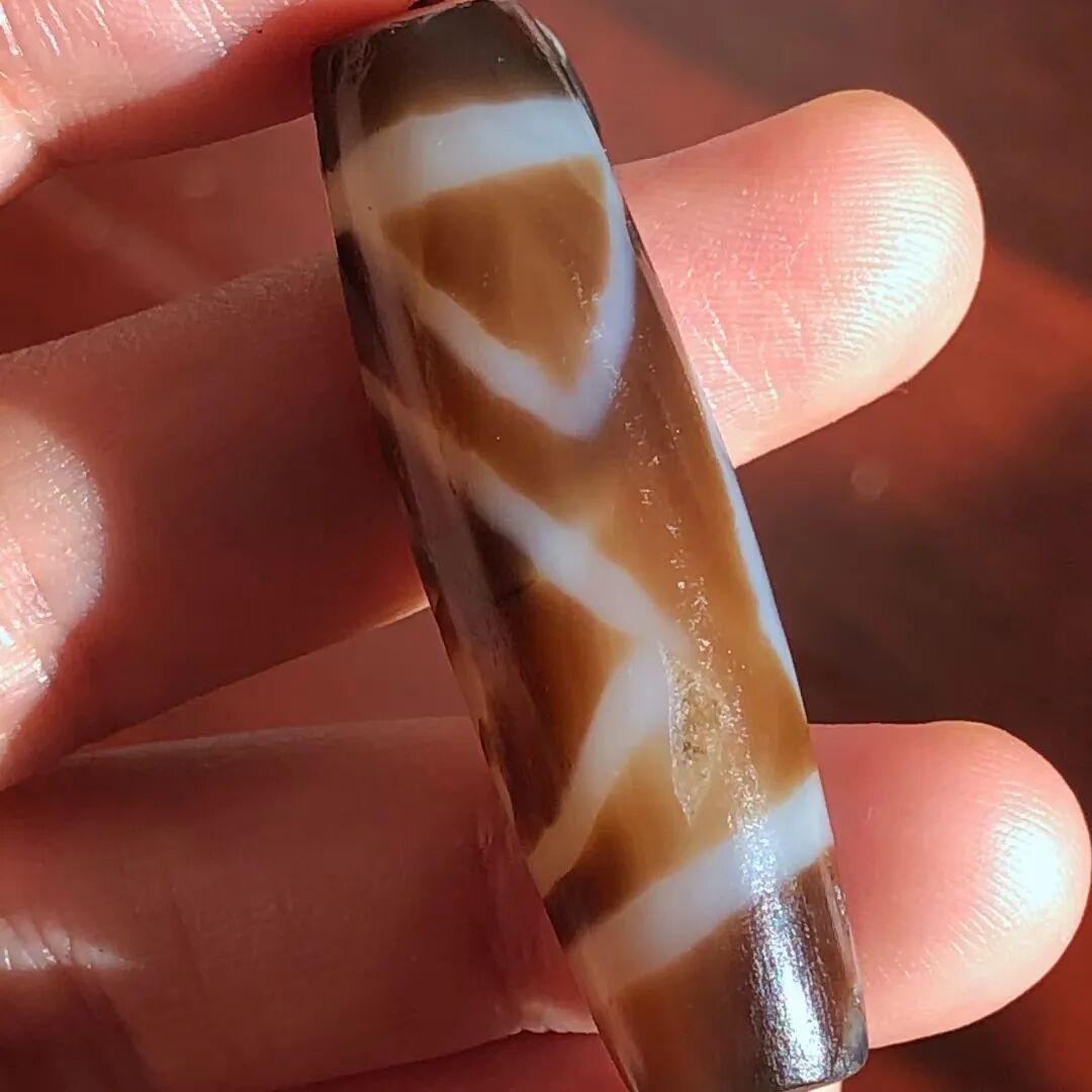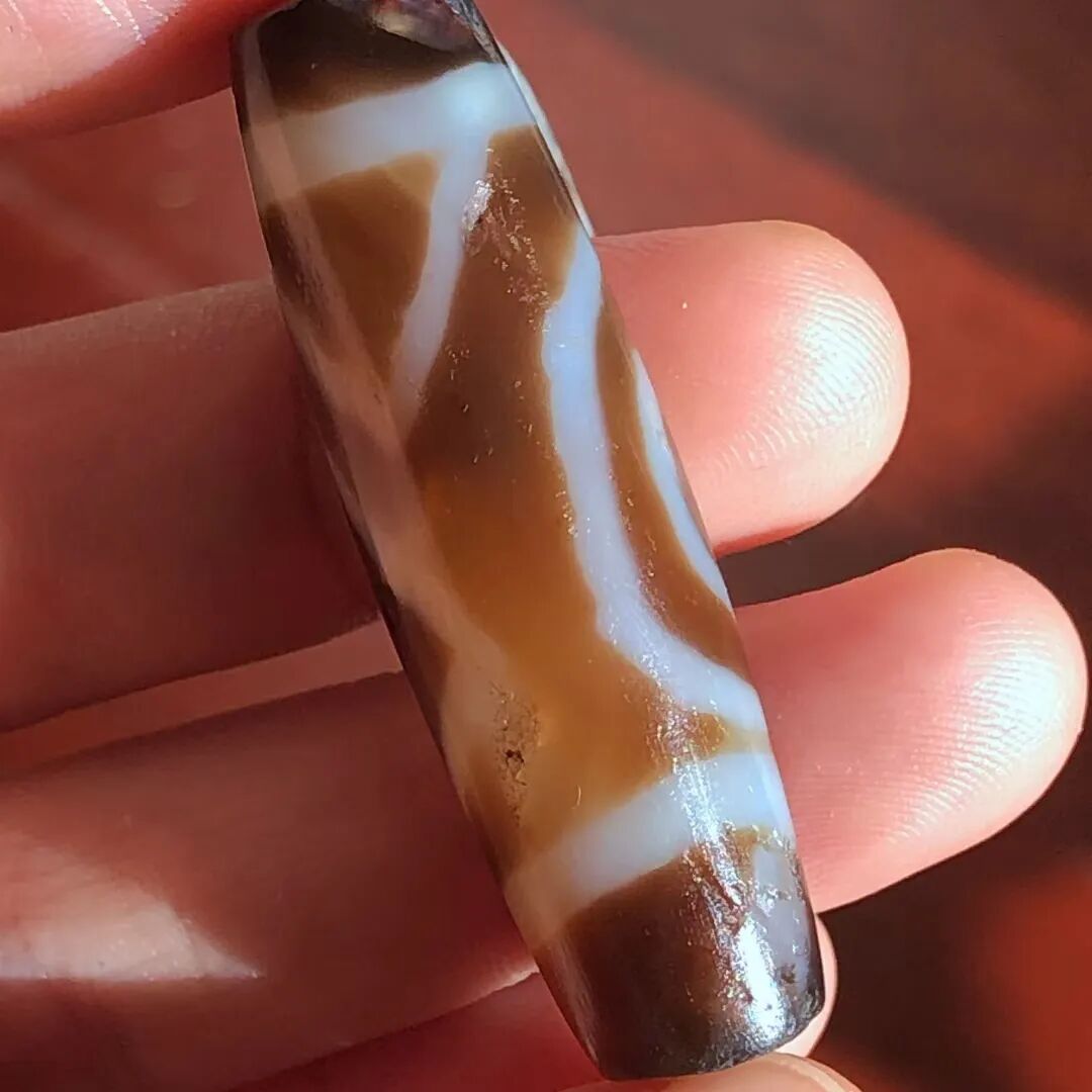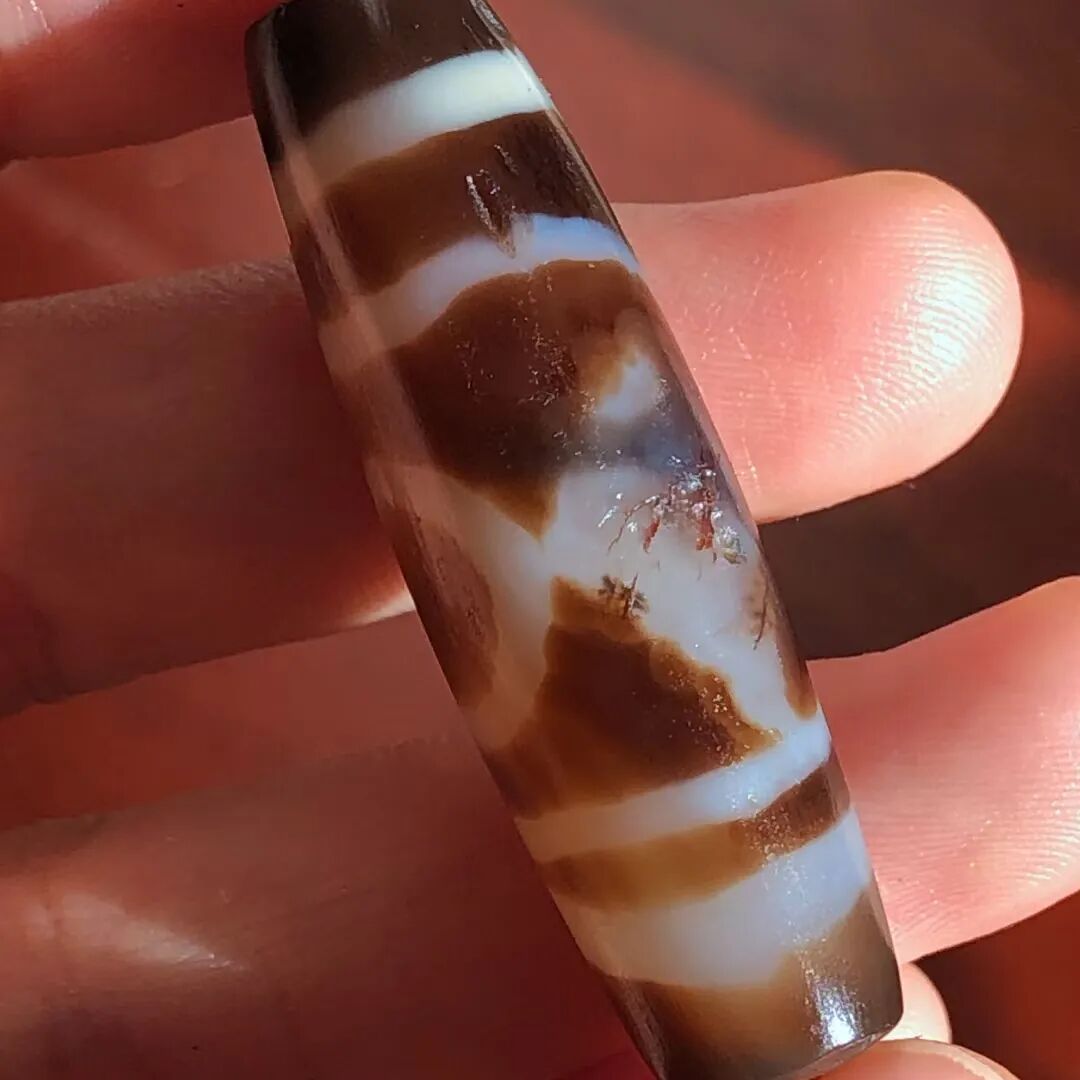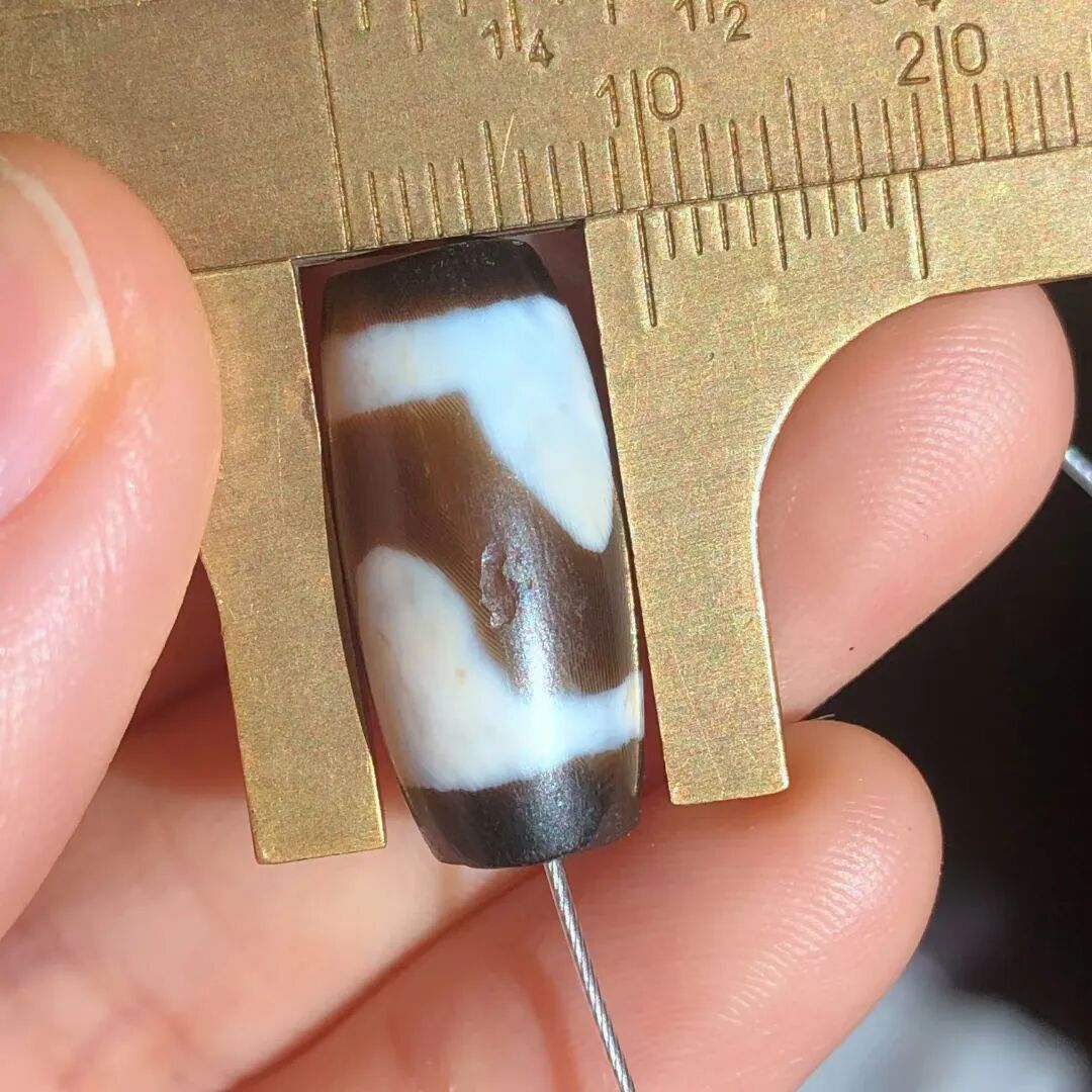 天珠(Dzi/Gzi):藏文音译近“思”多出现于喜马拉雅山周边地区,是在一定时期用特定的方法选择特定的原材料制作的带有类似眼睛和线条以及其他宗教图案的蚀花珠。先前学术界根据其工艺与视觉特征均以“蚀花玛瑙或者玉髓”为其命名,专业检激机构检测的样板报告中将其材质称为在“高温、高压”下形成的质点排列不同于普通玛瑙玉髄的隐晶质矿物的一种,相比普通玛瑙玉髓,其矿物晶粒更为细小、细腻。