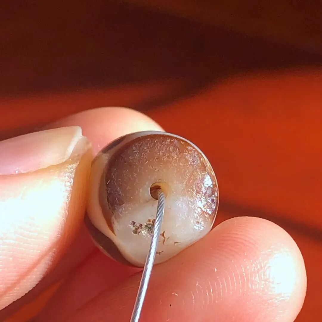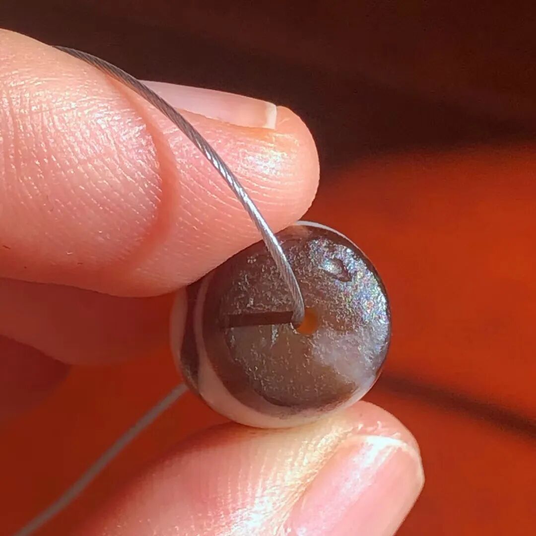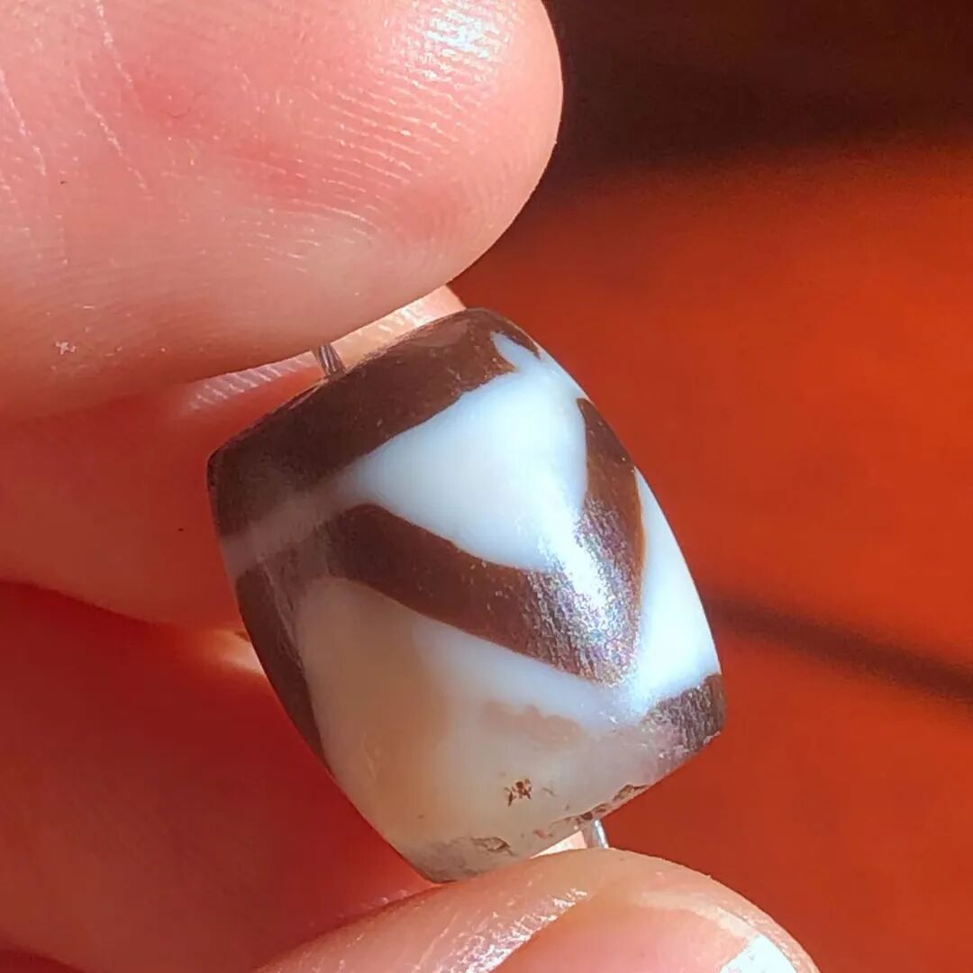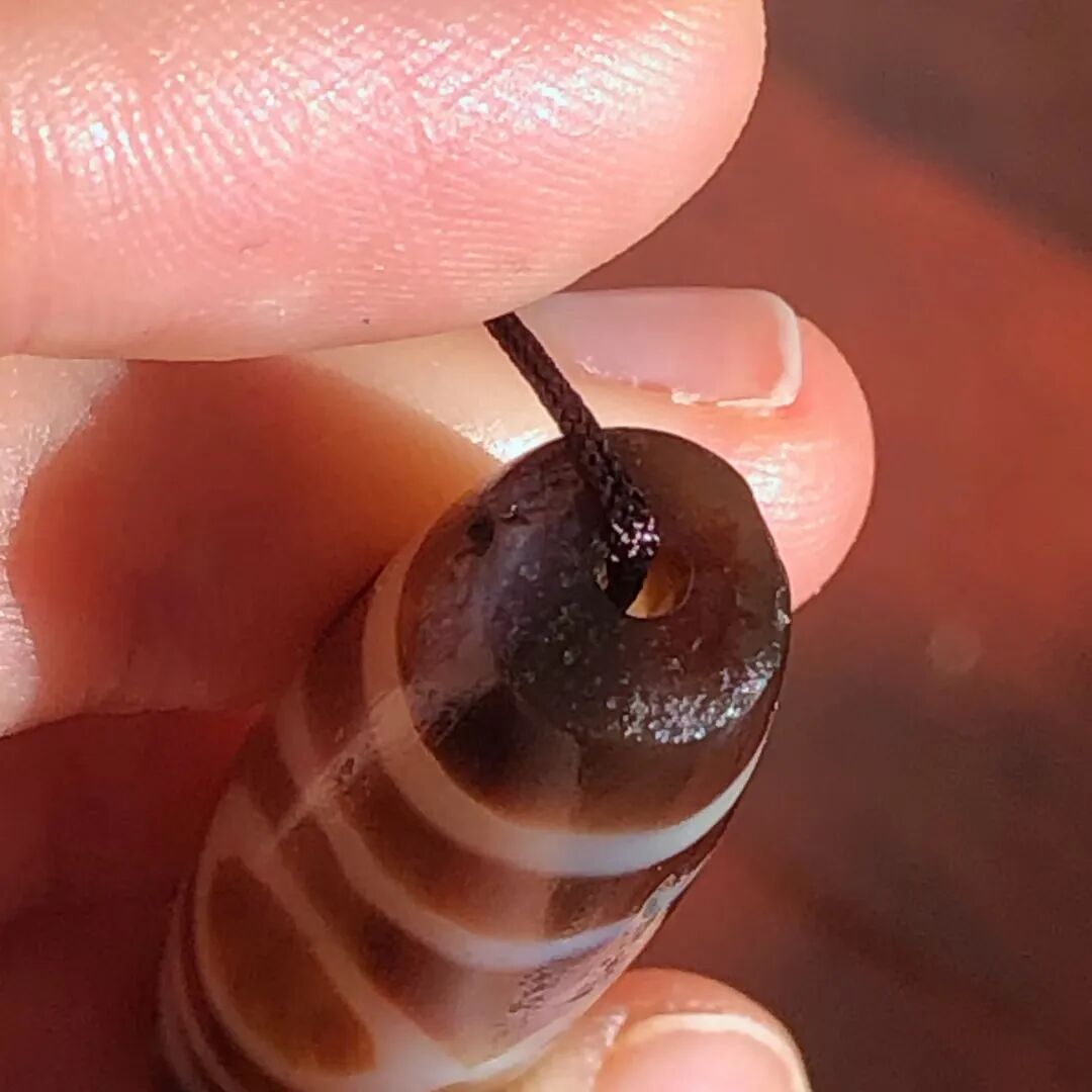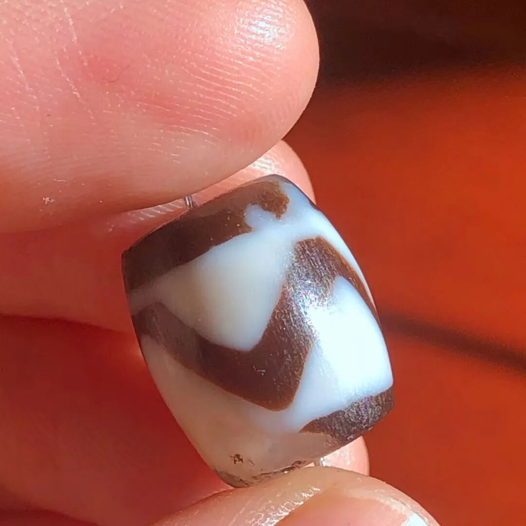 天珠(Dzi/Gzi):藏文音译近“思”多出现于喜马拉雅山周边地区,是在一定时期用特定的方法选择特定的原材料制作的带有类似眼睛和线条以及其他宗教图案的蚀花珠。先前学术界根据其工艺与视觉特征均以“蚀花玛瑙或者玉髓”为其命名,专业检激机构检测的样板报告中将其材质称为在“高温、高压”下形成的质点排列不同于普通玛瑙玉髄的隐晶质矿物的一种,相比普通玛瑙玉髓,其矿物晶粒更为细小、细腻。