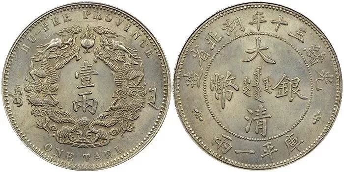 总述:这枚一两面值,大小与七钱二分银币类似的湖北省硬币是在光绪三十年发行的,主要用于地方流通。它有非常独特的双龙图案,这种图案很少出现在铸币上。和先前湖北省发行的钱币一样,这枚硬币在流通上并没有被人们所接受,因而停产。这枚硬币仅发行了一年,热门而且贵重。