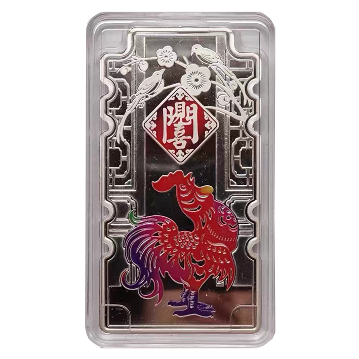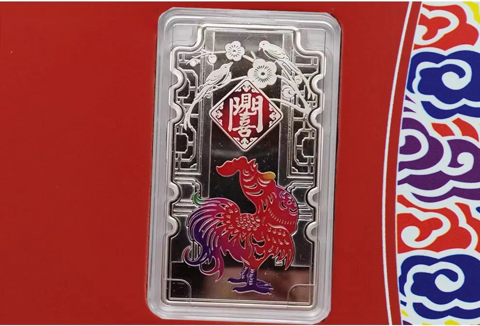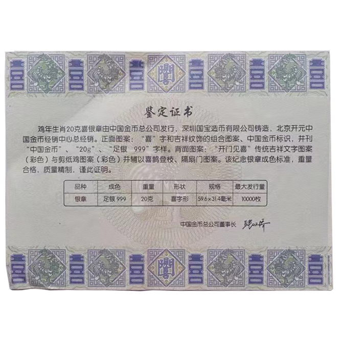 买银币收藏,肯定要买权威出品的才放心,既不担心缺斤少两,也更保值,毕竟这年头,连大银行出的金条,都可能会“吸铁”,咱老百姓买真金白银,就图个实在!而且这种机构出品的藏品都是经由专业画师设计,光从颜值上来说就秒杀市场其他商品。生肖题材在收藏界里永远不会过时!题材是死的,但是设计是活的,咱们玩这种题材就是要玩精,玩稀!今天给大家带来的这枚鸡年银章就是由中国金币总公司权威发行,发行量仅有1万枚。每枚章都带有一张由中国金币出具的鉴定证书,还配备原装盒,品质、颜值双重保障!这枚银章的设计真的没话说,非常符合我们中国人的喜好,正面是一个大大的“喜”字,其反面设计也很有意思--“开门见喜”。