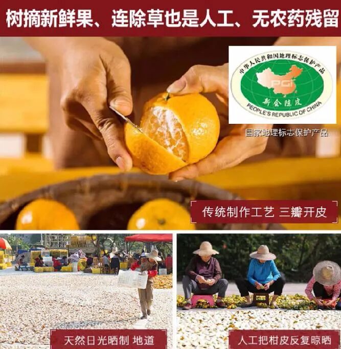 陈皮,原产于中国西南地区,中国人使用陈皮的历史已经有上千年。陈皮,丰富并滋润着中国人的生活,也形成了独特而深厚的陈皮文化。中国已经有一千多年的陈皮使用史,陈皮独有的特性,使其越陈越香。熟悉陈皮的人都知道这样一句话——世界陈皮看中国,中国陈皮看广东。然而广东有一顺口溜:广东有三宝,陈皮老姜禾杆草。其中,“陈皮”是指“广陈皮”,为陈皮中的佳品,而“新会皮”是“广陈皮”中的上品。新会陈皮古今闻名,“百年陈皮,千年人参”、“一两陈皮一两金,百年陈皮赛黄金”都是对新会陈皮的夸赞与认可。看到这,茶友的问题肯定来了,我也喜欢陈皮,但是我怎么才能买到品质好,价格实在的正宗新会陈皮呢?(往下看,惊喜等着 您)去柜台买?我劝您只是想想算了,中国的经销商模式,层层加价,到茶友手中剩的只是高价。这正是不少茶友花了大价钱却买到品质一般的陈皮原因。大家好,我是广东新会陈皮制作技艺第六代传承人,从小在新会茶坑村长大,并且在十岁的时候便开始跟着家中长辈纯手工制作陈皮。我们家住在新会区茶坑村,从爷爷那辈开始,自家就从源头种植纯手工天然制作新会陈皮,现在家里有三片柑园,都是采用生物灭虫方法有机种植,不打农药不放添加剂,我们只是大自然的搬运工!好多厂商都找我们供货,每年有好多老客户专门采购预定!每年到采摘季节,都会邀请茶友过来柑园体验采摘制作,一起宣传陈皮文化和传承!世界陈皮看中国,中国陈皮看新会。广东新会陈皮是陈皮中的上品。近几年来,喜欢新会陈皮的人越来越多,收藏陈皮的人更多,疫情过后陈皮价格被炒的越来越高...真正的陈皮果农,并不像我们想象的那么容易,不良陈皮商收陈皮的价格越压越低,一年到头辛苦忙碌却什么也得不到,反而是陈皮商转手卖到外面,价格就能翻好几倍,关键是品质还没保证!