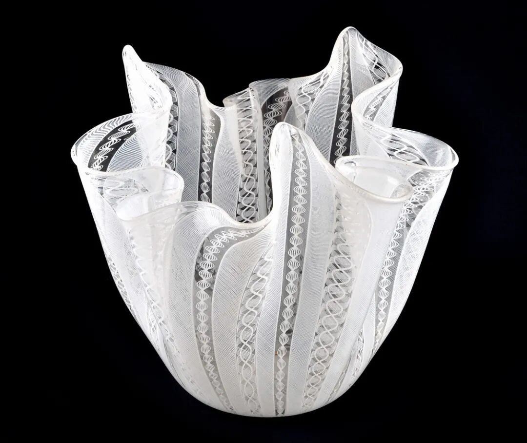 ▲穆拉诺蕾丝玻璃手帕花瓶(约1950)