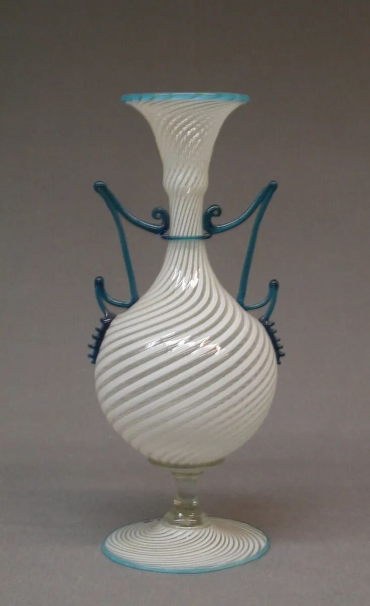 当时,穆拉诺玻璃工匠多沉迷于技术创新试验,精益求精,以作出精美、独特、与众不同的玻璃艺术品为荣,其中最重要的一项技术革新是花丝玻璃,它是由菲利波·卡·德拉·塞雷纳(Filippo C. della Sirena)在1527年左右发明的,它通过多道复杂工序以各种方式将乳白色细玻璃棒包嵌入透明玻璃内并经多次烧制熔融从而形成平行或交织的丝纹玻璃。![]()