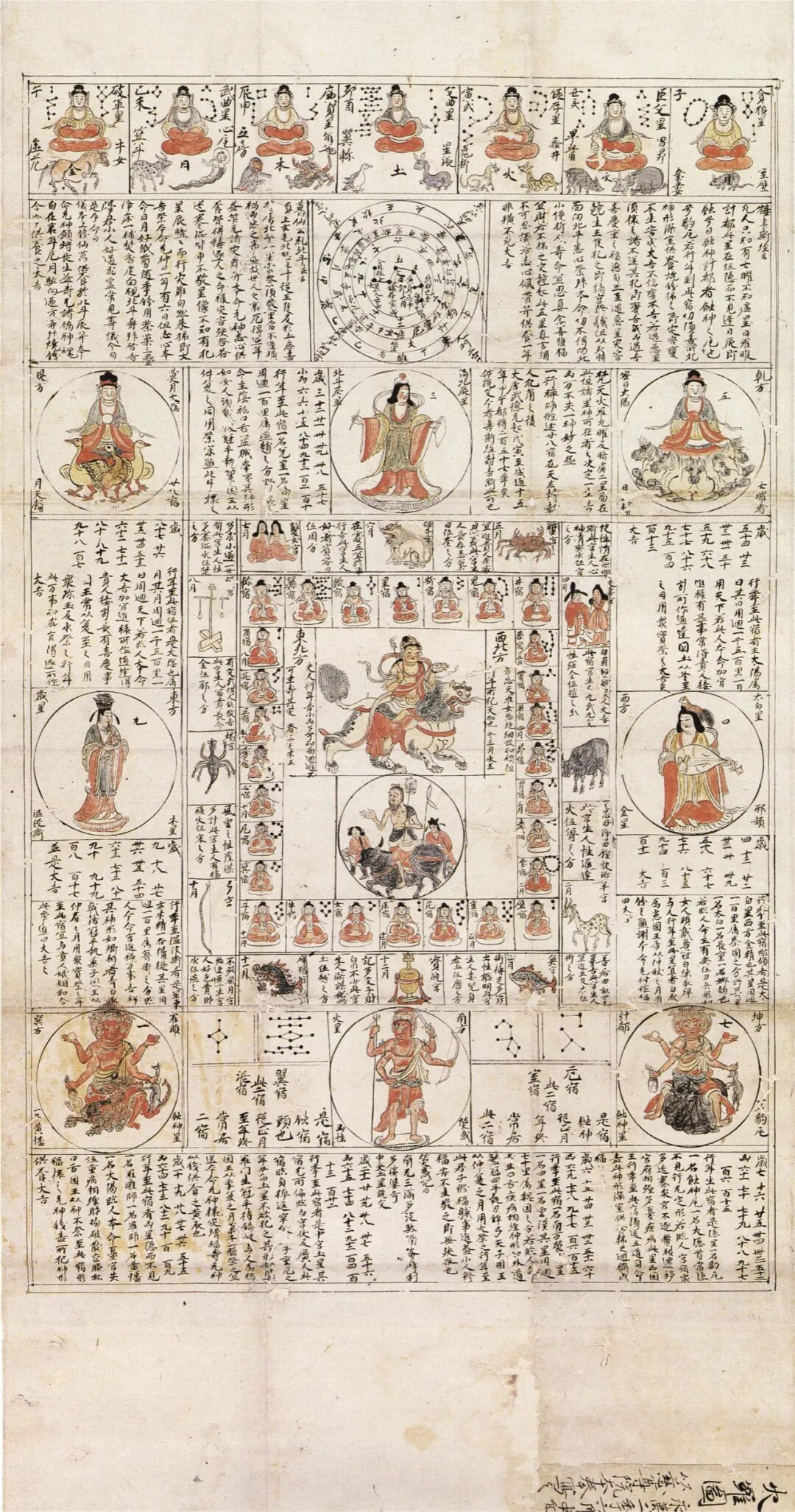 当九曜(太阳、月亮、金曜、木曜、水曜、火曜、土曜、罗睺和计都)中的某个成员进入本命宫——这种进入被视为“访问”还是“入侵”,取决于人们认为他们的倾向是哪种,本命宫与其定位上的变化会引起人们的严重担忧。在没有罗睺和计都之前,当星宿阵容只有五曜的时候,人们关心更多的是这五个之间的适当对应。现在,阵容里加上了两个图谋报复的成员,星宿的构成成了一件更明确、易解、夸张的事。有些描述说五个好星(太阳、月亮、木星、金星和水星)对四个恶星(火星、土星、罗睺、计都)。[51]另有一些描述,在流传中更受欢迎,持定一个扩大了的六大恶星名单,把水星和金星也跟火星、土星、罗睺和计都放在了一块。[52]人们都知道隐形的罗睺和计都能“暗行人本命星宫”,[53]那么这样产生的结果是,难以控制的星宿侵入人的“本命宫”,或与各项重大人类事务相关的其他岁星,就引起人们的严重担忧。如果天上的太阳、月亮和好星被坏星取代,那么地上接着就可能发生混乱和灾难。那在这种时候练习咒术就至关重要了。人们受指示作出某些印契(mudrās),并诵念某些咒。为了进一步协助星曜之间在人的“本命宫”的大战,宜设立道场,行大白衣观音,或文殊八字,或炽盛光佛顶道场法。东寺的天宫图(图13)是一个包括文殊八字的样本。[54]吉美博物馆的绘画(图12)可能用于献给炽盛光佛的道场法。[55]尽管可能祈求的是不同的大神——观音、文殊,或炽盛光佛顶,他们的共同之处是承担平息难以驾驭的星宿的角色。