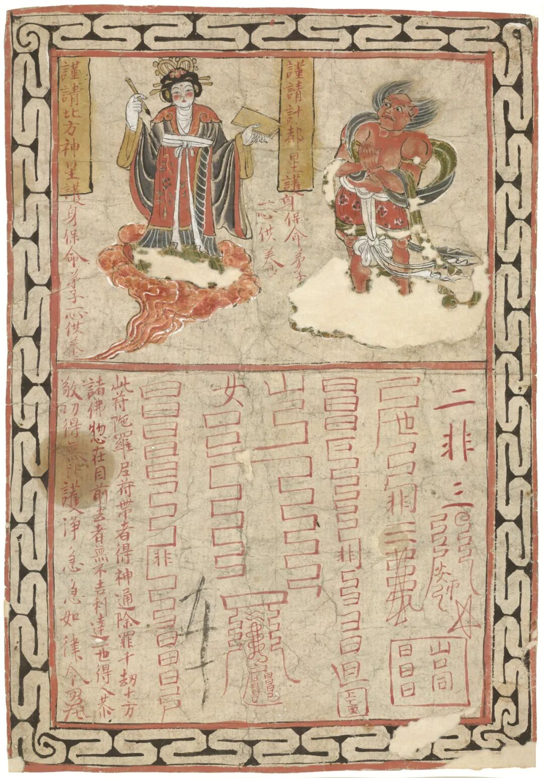按照传统,为保证经咒的仪式效验,人们认为“书写此陀罗尼”,[73]或“如法书写此咒”的动作具有很强的象征性。[74]现在大英博物馆[75]的一幅敦煌绘画(图14)说明了这点。这幅画的构图分为两域。上域画的是北方神星,不是水星/辰星[76]就是妙见菩萨(Sudar-ana),[77]她在这里作为一个面对星神计都的腾云女神出现。[78]这个北方天神拿着一支毛笔和一张纸,表示她的法力在于她书写“陀罗尼符”的能力。果然,下域包含六列符咒,接下来是一个说明:“此符陀罗尼符带者得神通除罪千劫十方诸佛惣在目前……”说明以一个典型的道教惯用语作结:“急急如律令”。这幅画明确表明,人们理解陀罗尼等于道教的符,符咒的效验来自“书写它”的象征性动作。[79]