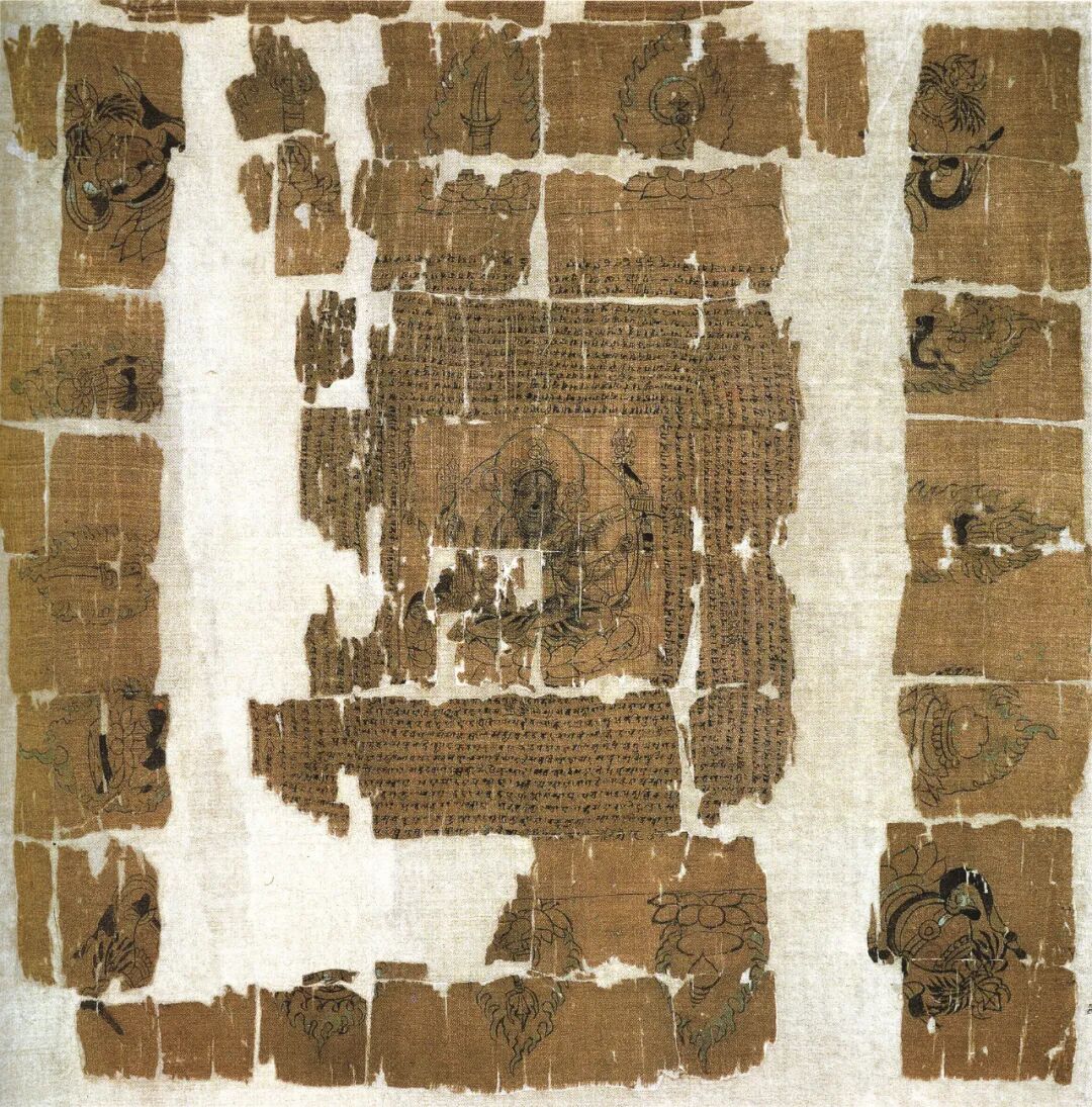 图 5 ˉ 西安唐中期墓葬里发现的画在绢上的经咒图案,描绘虔诚信士:一个叫焦铁头的男人虔敬地跪在六臂大随求菩萨旁边,26.5cm×26.5cm,陕西省博物馆藏