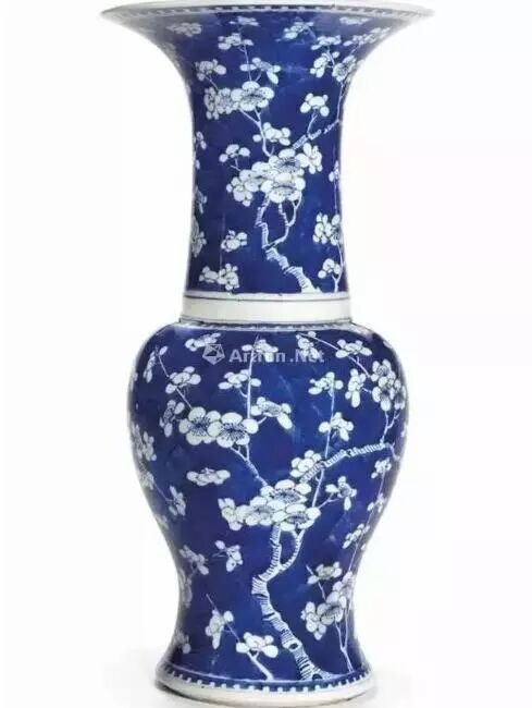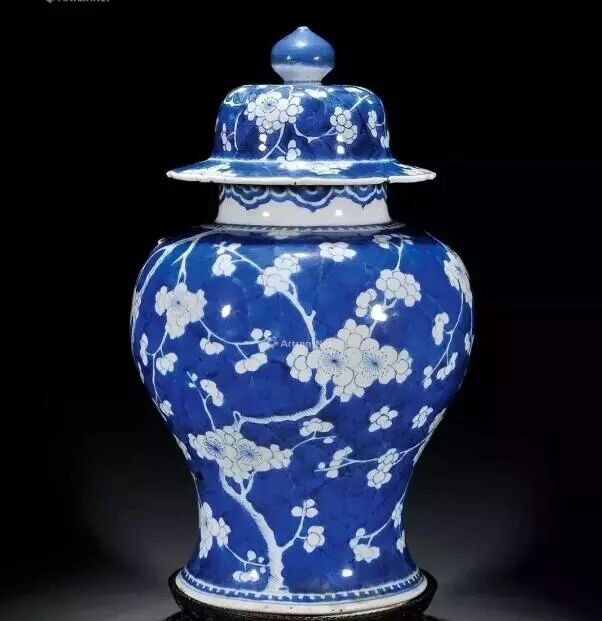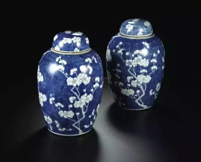 将官窑单色裂纹釉面的效果与朵朵梅花相结合,用陶瓷绘画的方式令其完美发展,从而形成有特殊美感的装饰纹样—冰梅纹。清代康熙时期的冰梅纹饰以浓艳的钴蓝青料作器物的底色,留出白梅的轮廓和冰裂纹的线条,然后沾淡青花料勾勒出梅花花瓣和枝干。绘画方式较为写实,花形饱满,高雅别致,冰梅勾画细腻,富有变化,艺术成就最高,通常以不规则的短线组合,来表现冰裂纹。清代初年,擅长骑马射箭的满人由草原进军入关,当时的清代官民都钟情于绘以蓝天白云的青花瓷;发展到康熙时期,王朝正值盛世之景,康熙皇帝也对振兴景德镇制瓷业给予不遗余力的重视和支持,办事责切之威势,集景德镇御窑厂督陶官和工匠们智慧的结晶,选用来自云南的珠明料,配合使用景德镇优质高岭土,终于不负众望,创造出了独壹无二的冰梅青花。自此之后,冰梅纹饰大行其道,一直为后世模仿,但终不能得康熙冰梅之真谛。清代雍正、乾隆时期对织金加银方法,作了很大改进,金丝细如毫发,花纹织后不露痕迹,"冰梅纹加金锦"为代表作。此锦地布以不规则的冰裂纹,梅花为主体。形成了线与面的对比,有"乱中见整"的艺术效果。雍正时期的梅纹构图疏朗,画风豪放,层次感较好。乾隆时期的冰梅冰裂纹复线勾描,走向规矩,缺乏自然变化,画工艺术成就变得不高。![]()