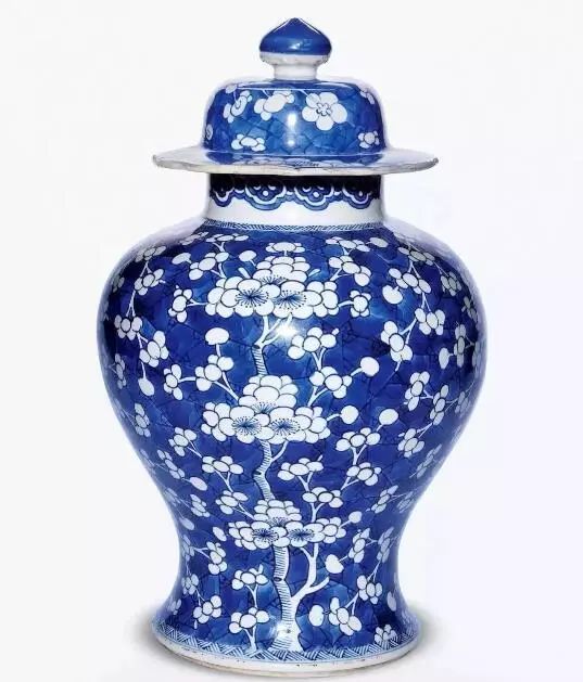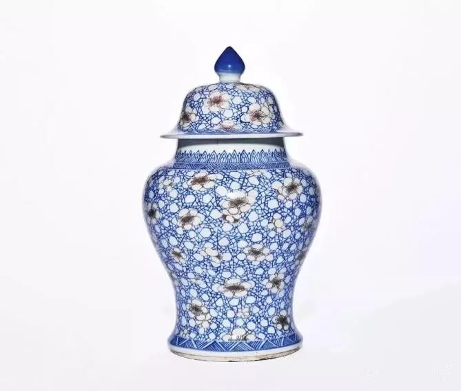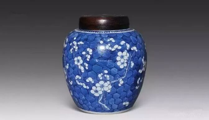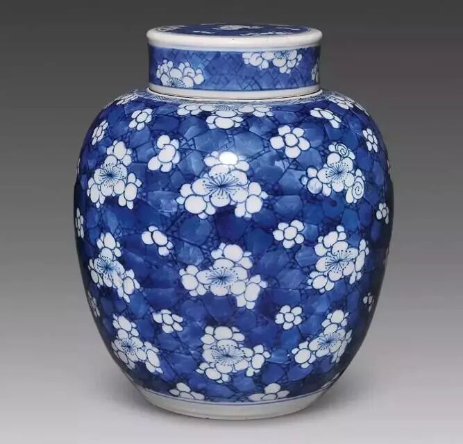 景德镇窑冰梅纹多以青花或五彩作画,尤以青花作画者最见格调,多饰于瓶、罐、盘等器物上。康熙冰梅纹盖罐为最典型的冰梅纹作品,其通体以青花浓料画冰裂片纹,以青花淡料略加晕染,其间勾画白色梅花,蓝白相映,寒梅吐艳尤显芬芳,颇具文人风韵。晚清、民国窑瓷上,亦多有摹绘。清末民初许之衡在《饮流斋说瓷》“说瓶罐第七”中谈到过一种“梅花罐”。其文曰:“梅花罐,周身绘冰纹,藏梅花片片。制始康熙,历代均有之。形不甚大,在当时亦粗料耳。然此等物料已非后世所有,故迩来声价,亦颇腾跃五都。”冰梅纹瓷器在釉面绘画上朵梅或枝梅,将冰裂纹釉面的肌理与梅花纹完美结合。