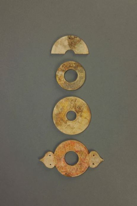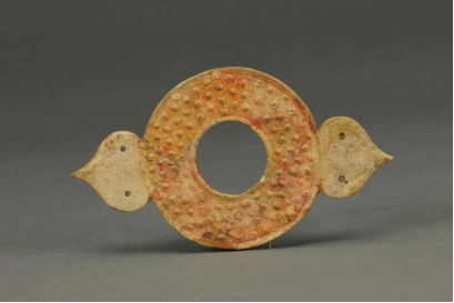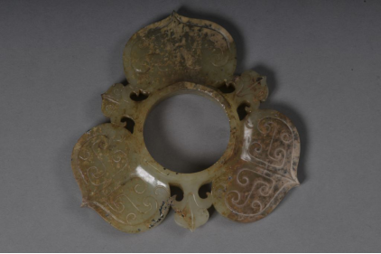 如果说墓中出现的四瓣、八瓣柿蒂纹支持了李零先生的观点,而两瓣、三瓣、五瓣仿佛就像是古人在“二创”。两瓣的柿蒂纹与玉璧相结合,就变成了仿佛会飞的小玉璧。这件涡纹璧是东侧室出土F组组玉佩的组件,两面涡纹,外周附有2个对称柿蒂形饰,上面线刻花芯纹和斜线纹,各有两个穿孔。其花瓣造型也符合一尖两弯的特点,在南越工匠的巧手下,花瓣还能化作玉璧的小“翅膀”,不禁要为这想象力拍手叫绝!三瓣花形出现在两处:一处是铜承盘高足玉杯的组件——三瓣花瓣形玉片,有三片花瓣,花瓣连接之处另有三小瓣花朵,中间镂有圆孔,花瓣上刻有勾连云纹,玉片位于高足青玉杯上下两截之间,刚好遮住了玉杯之间的缝隙。另一处是在金釦象牙卮的卮盖上,盖顶中心为一圆圈,圈外是用双线勾勒的三瓣花纹,花瓣连接处内弯。五瓣花形出现在一件玉剑首处,其正面中心处浅雕有五瓣柿蒂纹,花瓣中间内凹,外圈为勾连云纹。如果说四瓣、八瓣是指示方位的方花纹,那么两、三、五甚至是六瓣的花纹更像是古人在方花纹上的二次创作。无论数量怎么变,其造型都是以“一尖两弯”勾勒出花瓣的造型,这与卷云纹、如意纹又有着相似之处。此类花纹花瓣的数量各有不同,其使用纹饰的器具类型也极为多变,有玉器、漆器、象牙器等,可见秦汉时期这一纹饰运用广泛,是常见的装饰纹样。尽管“柿蒂纹”的说法颇有争议,不过使用已久,且与纹饰外形颇为契合,所以也沿用至今。我们在欣赏文物时,也不妨将“柿蒂纹”视为古人对春景的赞美和留念,毕竟春光易逝,这些纹饰为世间留住了数千年前的美好春景。
