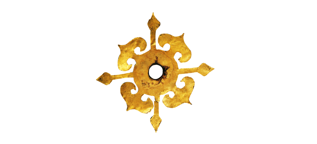 西汉时期的植物纹饰正处于早期阶段,因此在器物上较为少见,不过偶然间也能看到花、叶、树的亮相,它们出现时一般和鸟兽结合起来,作为一种烘托主题的纹饰。在南越王墓出土文物上,有一种特别的花卉,常被称作“柿蒂纹”,这是因为其外形多为四瓣花,神似柿蒂。这种纹饰还有有两瓣、三瓣、五瓣甚至是八瓣的变形图案,特点是每个花瓣作“一尖两弯”。说是柿蒂,其实学界颇多争议,有莲花纹、方花纹、侯纹之说,甚至有学者将之命名为天穹之花。在众多讨论中,越来越多学者认为“柿蒂纹”的说法是望“形”生义,这种纹饰更像是脱胎于普通所见的花卉图案,代表着古人对日常所见植物世界的观察和创作。在南越王墓出土的文物中,柿蒂纹的形态就非常多样,先说常规的四瓣:墓中出土了一件菱花纹镜,考古报告中提及,其背面以水仙花做钮座,主纹系凹面对折菱形纹,另外还有4朵正在开放的水仙花装饰在菱纹之间。这里的水仙花,其实就是一种四瓣花纹,与考古中常见的柿蒂纹极为相似。因此在没有更多证据指向水仙花的情况下,这个纹饰更接近于四瓣柿蒂纹。另有西耳室出土六博棋博局上的金饰片也近似于柿蒂纹造型,这一金饰片锤鍱镂孔而成,中间作璧形,周边有四芯指向四方,另有四瓣带尖角的花瓣(或花叶)从四角伸出,四芯与四瓣相间环绕。这里的纹饰既保留了柿蒂纹四瓣花纹的主要造型,又在此基础上有其它的装饰元素。这与李零先生提及的“方花纹”概念较为接近。李零先生认为,战国秦汉流行以四瓣花标志四方,而所谓的“柿蒂纹”,只是这种四瓣花的一种,他认为柿蒂纹应为“方华纹”或“方花纹”,而“方花”的意思正是标志方向的花。他提及:“一般的方花纹有四个大花瓣,中间有时还夹着四个小花瓣,或尖或圆,小花瓣指四正,大花瓣指四隅……因此八瓣花是从四瓣花衍生,用以标志八位。”从这里的描述来看,这件花纹金饰片非常接近用于标志四正四隅的方花纹。![]()
