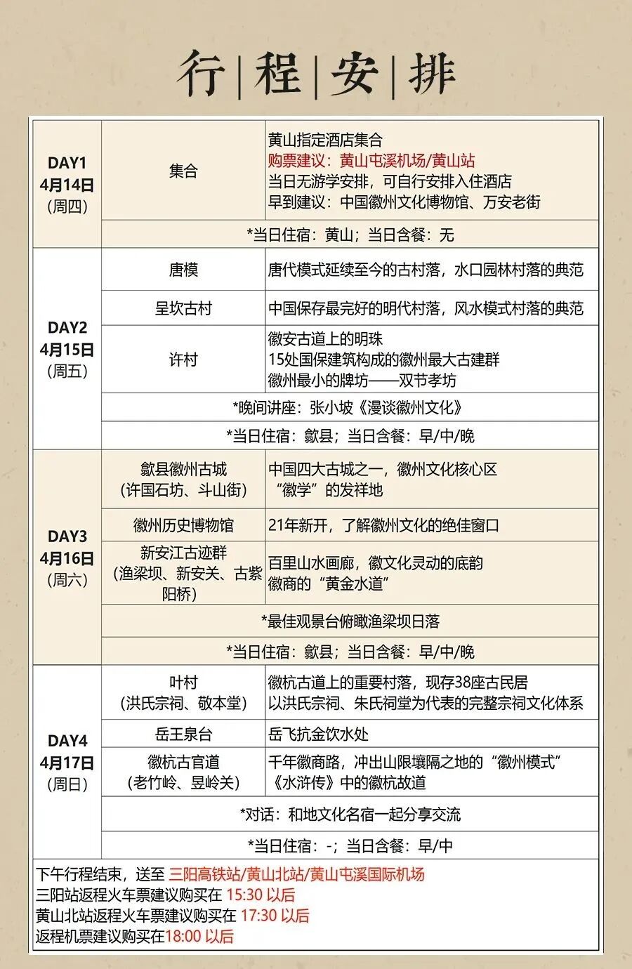 寥寥几笔,便把徽州这片极度容易让人沉迷的“水墨山景”,全然构画。这是一片安宁富庶的土地,“无农桑之利”的徽州人“以贾代耕”,叱咤中国商界300余年的徽商由此诞生。这是一片如梦似幻的土地,顺着新安江,那些粉墙黛瓦的徽派建筑,那些梦幻般的古宅宅邸、雕梁画栋,宛如水墨画一般,静静等待在青山深处。徽州780年的建府历史,浓缩了中国历史上的几次战乱、移民浪潮;徽州山水孕育出来的审美,奠定了整个江南的文化基调;徽州思想『徽学』也成了独立的学派,与敦煌学、藏学并列为国内地域文化的三大显学。4月14日至17日,和我们一起去徽州吧!趁着春色正好,跟随张小坡老师,一起重拾徽州文化,见证这个历史上独一无二的“痴绝”之地!安徽大学博士生导师。出版专著1部,合著3部,发表学术论文30余篇,主持国家社会科学基金项目3项以及中国博士后科学基金特别资助、一等面上资助项目等各类课题10余项。从徽州老城出发,穿过保存完好的明代村落、延续至今的唐代范式村庄,再到徽安古道、徽杭古道上散落着的小村落,我们将看见最完整精彩的徽派建筑群和遵循传统风水学理论,追求“天人合一”的思想的村寨聚落形式。在徽商创造的物质财富基础上,徽文化迅速崛起与繁荣。乾嘉学术、刻书版画、科技教育、新安医学、建筑书画以及戏曲的众多创新与发展,一度影响着中国传统文化的发展。我们特邀徽学文化专家张小坡老师全程带队,深度解读徽文化的演变与迁播4月,趁着春色犹在,我们沿着新安江踏歌而行,感受诗人口中“人行明镜中,鸟度屏风里”这种如山水画般又极为浪漫的极致风景。同时,亦是一次舌尖上的美食之旅,臭鳜鱼、毛豆腐、徽州三绝……定让你回味无穷。5年专业文旅团队操刀,全程四星级酒店住宿+当地丰盛特色餐食,优秀领队配合专业讲师全程随行,为您带来更舒适更有保障的旅途体验。徽州传统的古村落,以其“布局工,结构巧,装饰美,营造精,文化内涵深”的特点,被世人誉为“世界上最美的村庄”、“古民居建筑的宝库”。它们不仅布局与自然形态相融合,又遵循传统风水学理论,追求“天人合一”的思想,堪称中国传统村落形式典范。在外人看来,徽州的建筑仿佛是一个模子里刻出来的——无非是白墙、黛瓦、马头墙,美得千篇一律。但,即使村子内部的建筑装饰物有着一定的趋同性,宗族之间的志向差异也使各个村子有着完全不同的特色。也正是因此,原本仅是作为建筑装饰之用的徽州三雕,它们的意义早就不止于简单的装饰。它们参与着文化的传承、自身也成为了传承的一部分。难怪徽州“无宅不雕花”;难怪明朝嘉靖四十一年(1562),徽州府官定注册的工匠就有3066人。如今,那些精美的雕花、融汇书法的楹联、不同形态的马头墙……它们散布在老房子的四处,促成徽州子弟无形中对艺术审美的追求和享受。唐模地处古徽州腹地,是一个集水口园林、徽派建筑及田园风光为一体的中国传统古村落。晚唐五代时期,汪思立率儿孙迁移此处,逐渐聚族而居。汪氏子孙不忘唐朝对祖先的恩荣(唐越国公汪华),村落规模形制仿盛唐时的模式、风范、标准建立。经过几代繁衍,成为徽州地区数一数二的繁荣村落。现唐模村以狮子山为支撑点,其中水口园林是江南古村落中的的杰出代表,另存省保4处、清代祠堂4处,清代民居100多幢。呈坎是保存了最完整精彩的明清徽派建筑和聚落形式的名镇之一。呈坎的罗东舒祠堂,是徽州古祠中气势最恢宏的一座,我们可以看到徽派建筑的卓越成就。呈坎汇集了不同建筑风格的亭、台、楼、阁、桥、井、祠、社及民居等,在风水理论指导下营建布局的呈坎古村,结合山川形胜的组合设计村落朝向的布局,有了“登黄山天下无山,游呈坎一生无坎”,“中国风水第一村”的美誉。许村地处黄山主脉箬岭南麓,村落布局依据徽州传统的“风水”理论,至今保留“倒水葫芦”的基本形态。历史上,这里是徽州府的北向门户——徽安古道上的明珠。得益于较好的保护,许村现有200多幢古建筑存世,其中国保级别15处,是徽州最大的徽派古建群。建筑中又有精湛的工艺及巧夺天工的石雕、砖雕、木雕——徽州三雕。许村舞大刀是许氏后人为追怀忠义报国的先祖许远而创立的,也有人说是为了驱赶当地一种叫“邋遢相”的怪兽。大刀的制作保留着繁琐的手工工序,用毛竹做骨架,将白棉纸裱糊在灯架上,是许村独特的非遗文化符号。几次北方强宗大族的南迁,为这片土地带来了先进的生产技术和中原文化,而徽州文化,正是对中原文化最杰出的包容整合。如今,这些珍贵的文化遗存,正沉淀在徽州的古城之中。徽州的中心——徽州古城,古称新安郡,自唐代以来,一直是徽郡、州、府治所在地。县治与府治同在一座城内,形成了城套城的独特风格。徽州古城是保存完好的中国四大古城之一,包含徽园、许国石坊、斗山街、新安碑园、太白楼等七处历史景点。除此之外,徽州古城也是中国三大地方学派之一的“徽学”发祥地。在这里,覆盖了新安理学、徽派朴学、新安医学、新安画派、徽派版画、徽派篆刻、徽剧、徽商、徽派建筑、徽州“四雕”、徽菜、徽州茶道、徽州方言等徽州文化。又称大学士坊,是我国现存唯一一座八脚牌楼,也是徽州石牌坊中最杰出的代表,建于明万历年间。