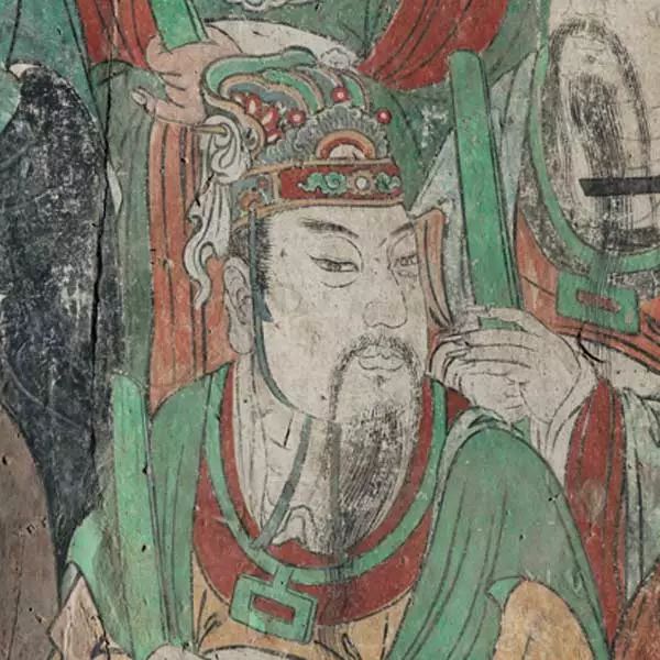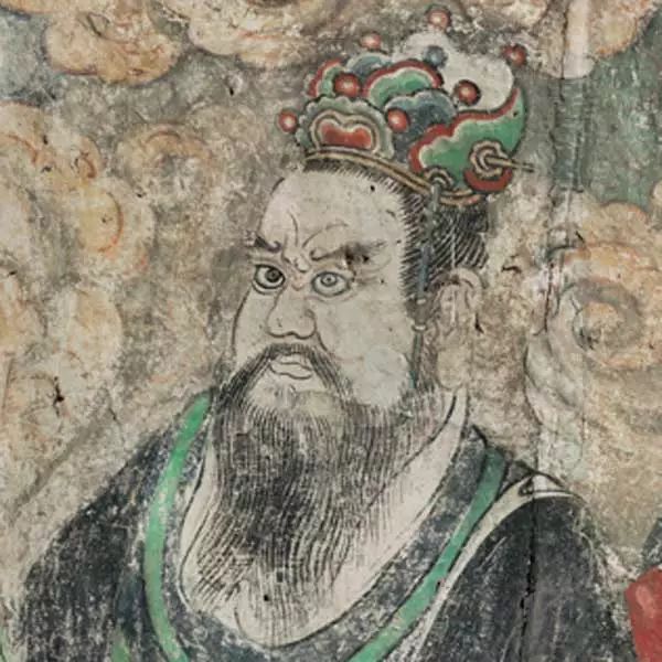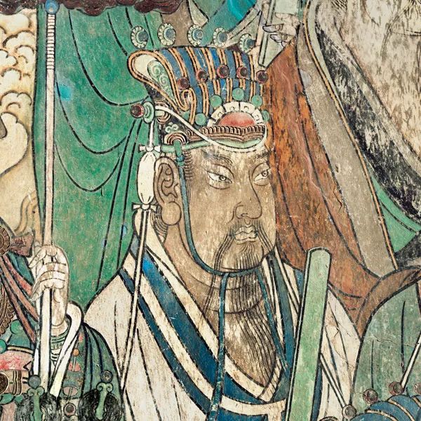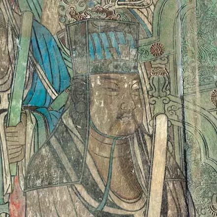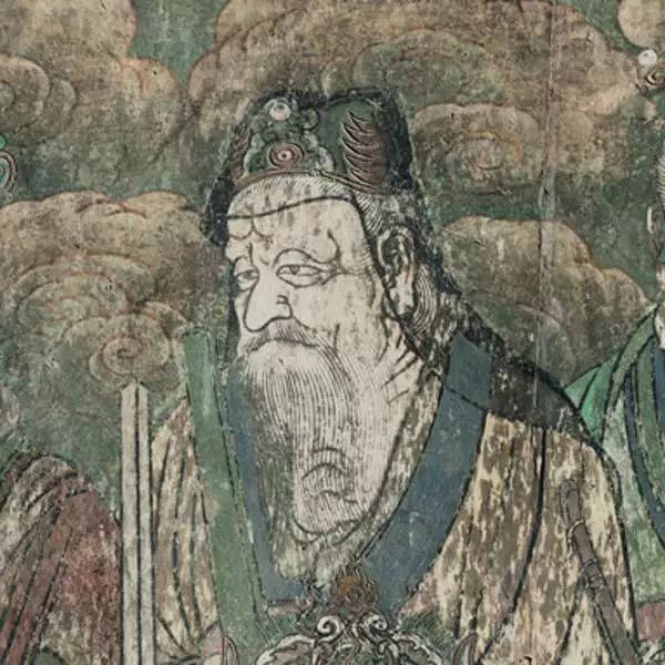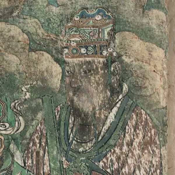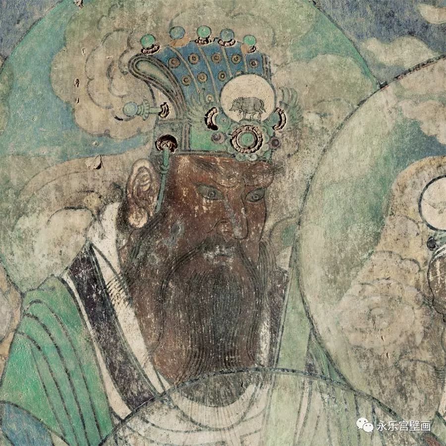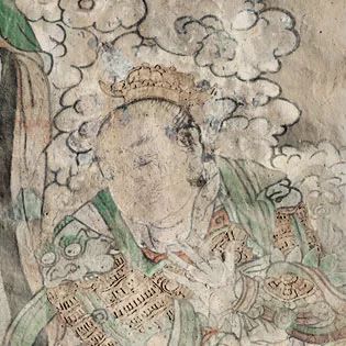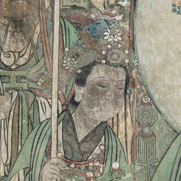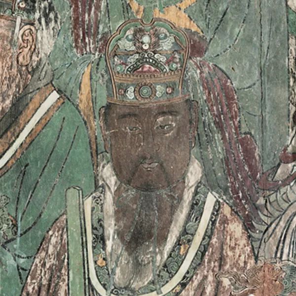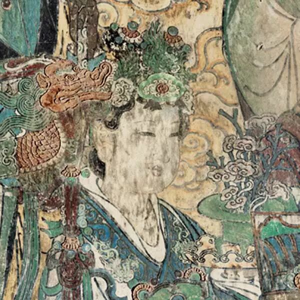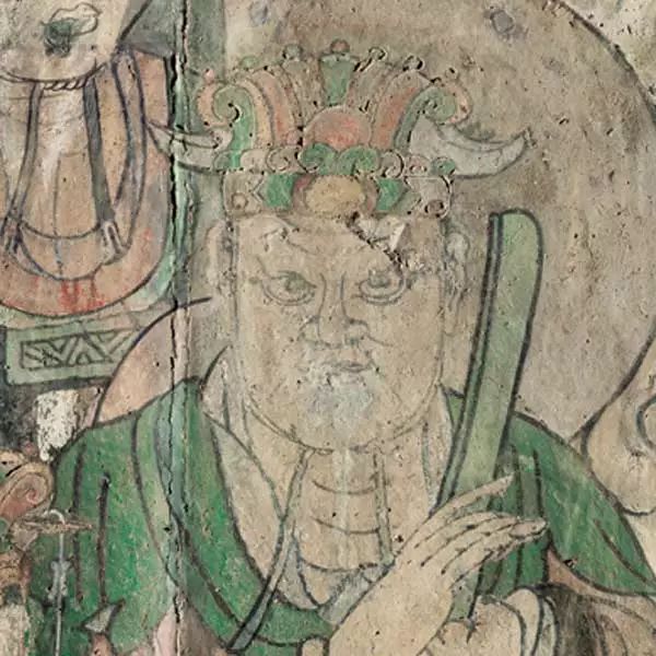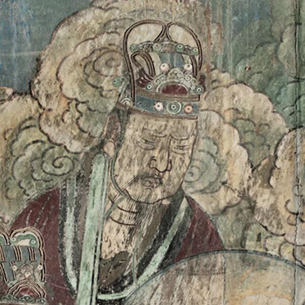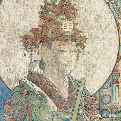 绘于东壁南后土娘娘,又称后土。源于母系社会自然崇拜中的土地与女性崇拜。全称承天效法厚德光大后土皇地只,是道教尊神“四御/六御”中的第四位天帝,她掌阴阳,育万物,因此被称为大地之母。相传她是最早的地上之王。后与主持天界的皇天大帝(昊天)相配合,为主宰大地山川的的女性神。
