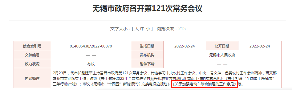 公告相关附件显示:2022 年4月1日开始,上线运行无锡市电动车综合治理智慧监管平台,凡是无锡市生产和进入无锡市销售的电动车及企业相关信息均需在平台备案,初步建立电动车和蓄电池数字身份追溯体系。