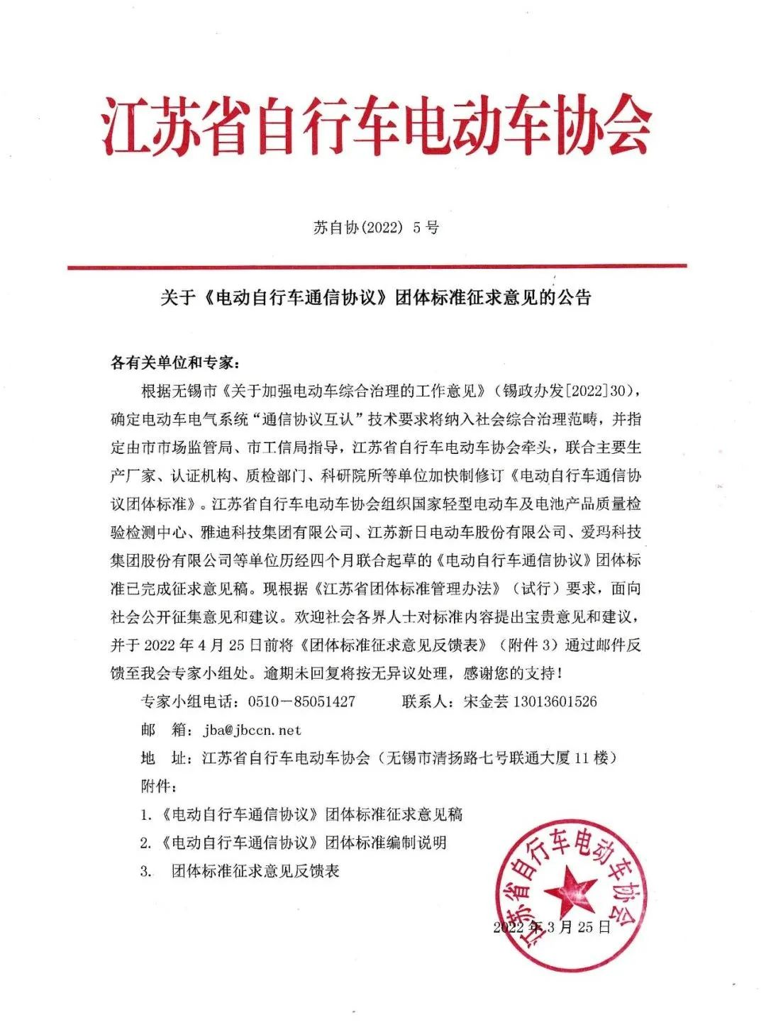 同时,江苏省自行车电动车协会也发布了关于《电动自行车通信协议》团体标准征求意见的公告。