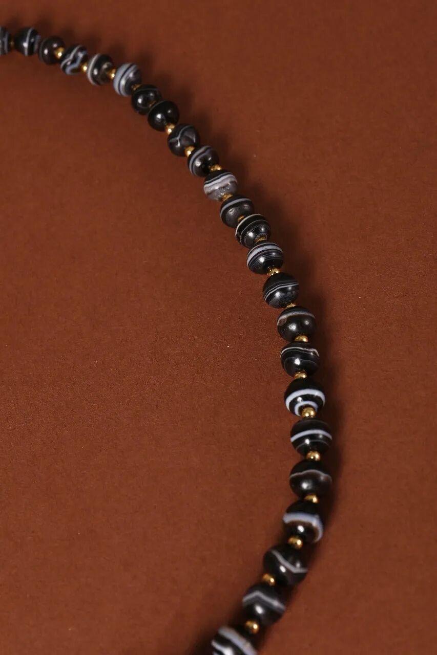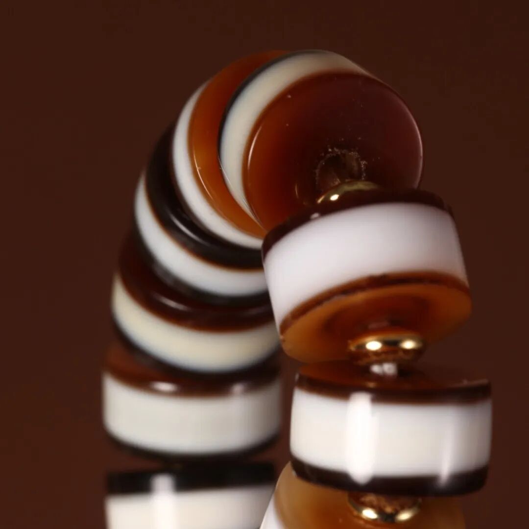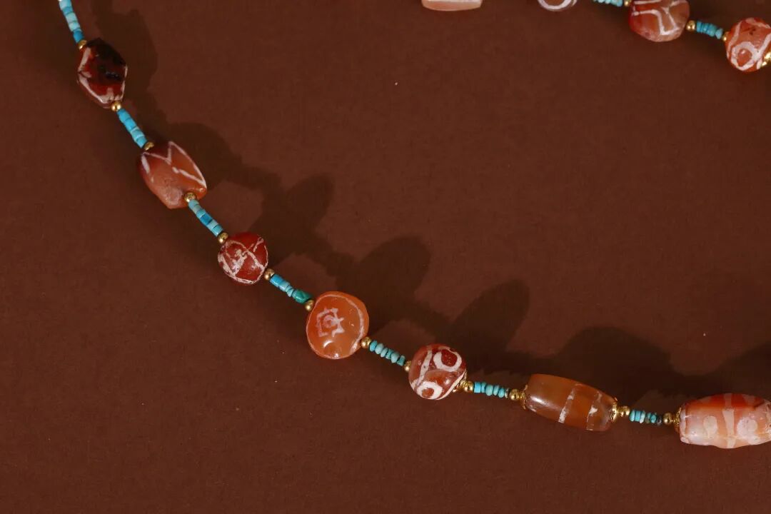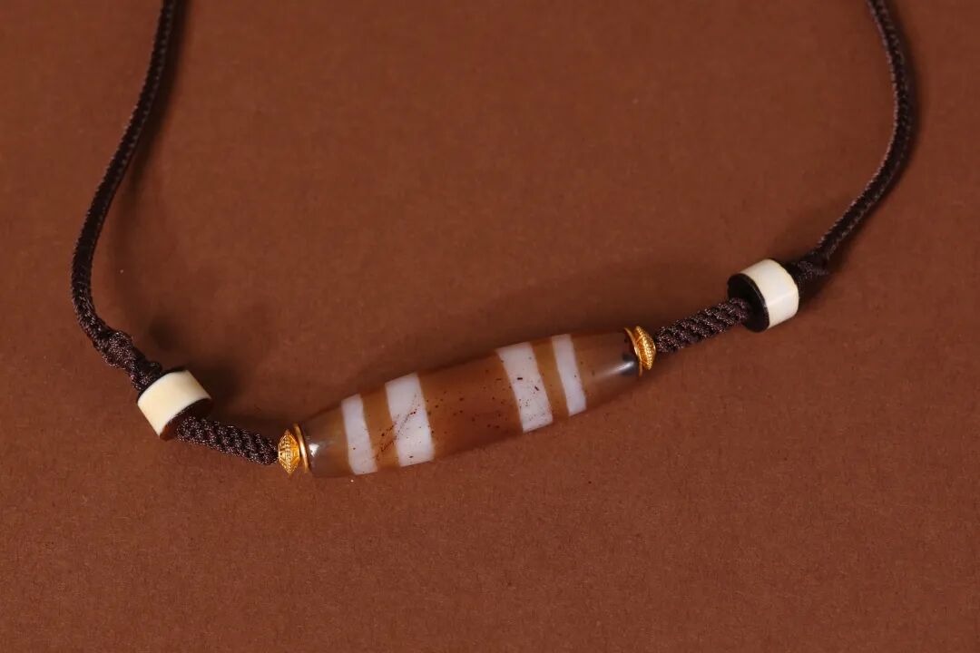 在古珠大家族中最为神秘的系列当属天珠,这类在藏语中被称为“dZi”的珠子,是藏族人民心中最具有护身符功能和特殊保护力的神秘珍宝。根据现代考古挖掘与科学研究的成果可知,古代工匠以玉髓为原料,运用蚀花工艺技术,令玉髓珠体的微孔隙中侵染了黑、白色素离子,再通过整体抛光来封闭珠体表面的晶间孔隙,使得蚀花颜色经久不褪。