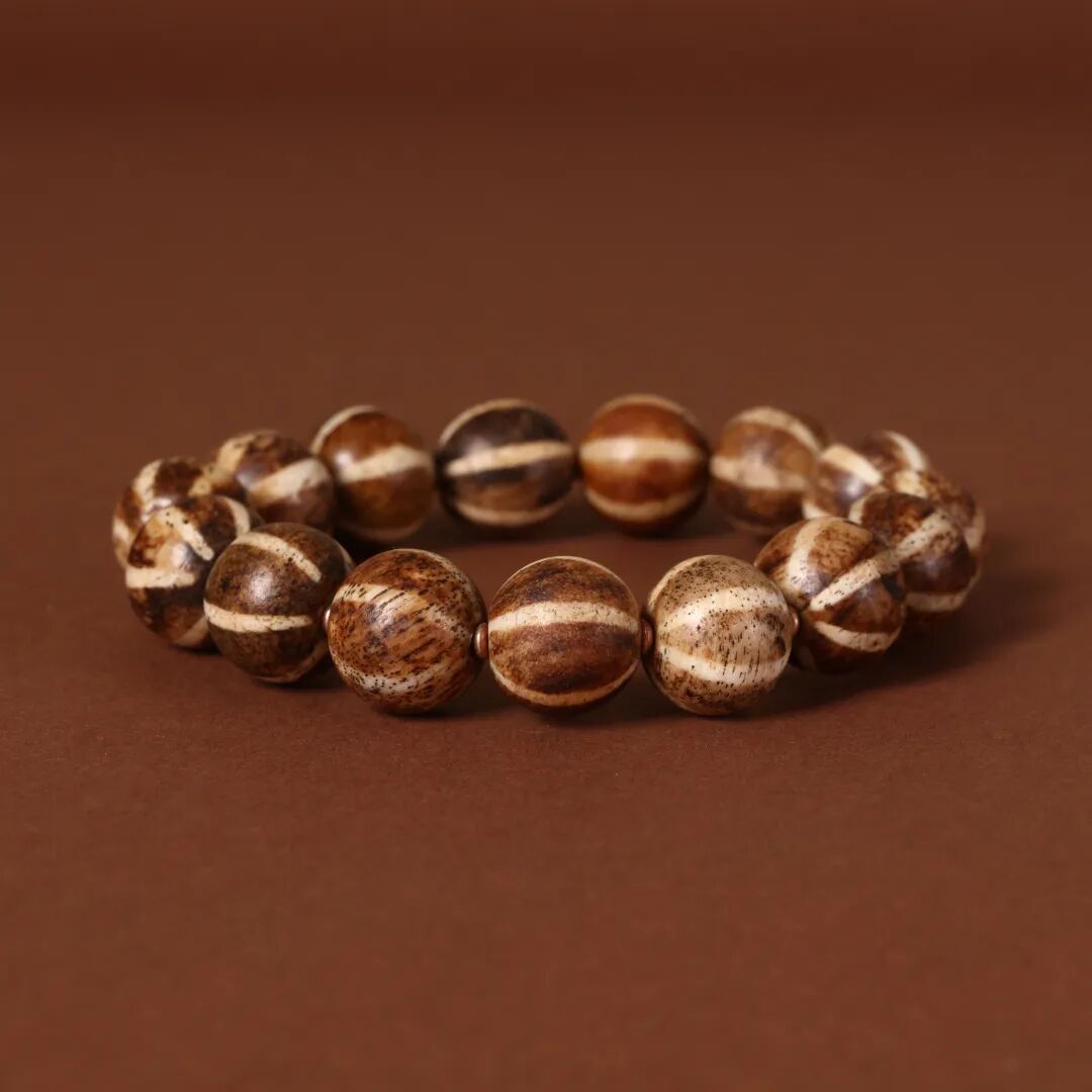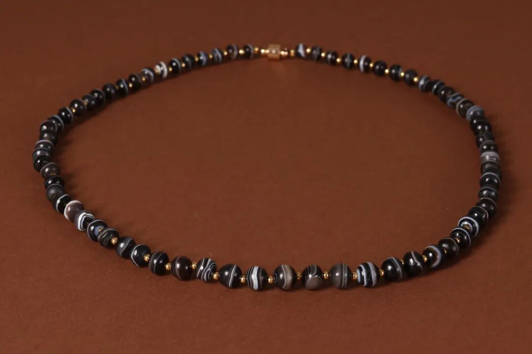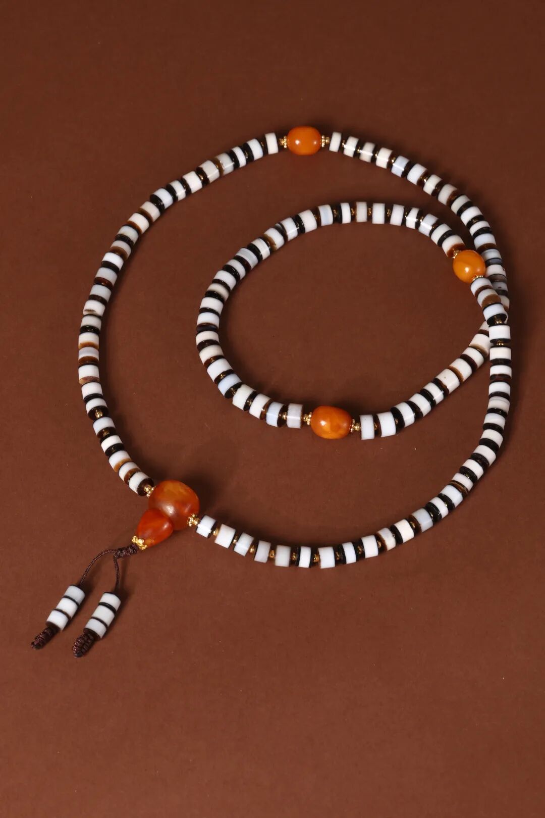在古珠大家族中最为神秘的系列当属天珠,这类在藏语中被称为“dZi”的珠子,是藏族人民心中最具有护身符功能和特殊保护力的神秘珍宝。根据现代考古挖掘与科学研究的成果可知,古代工匠以玉髓为原料,运用蚀花工艺技术,令玉髓珠体的微孔隙中侵染了黑、白色素离子,再通过整体抛光来封闭珠体表面的晶间孔隙,使得蚀花颜色经久不褪。