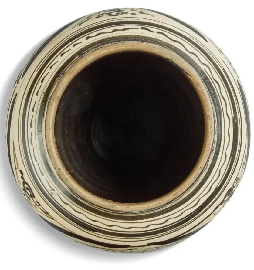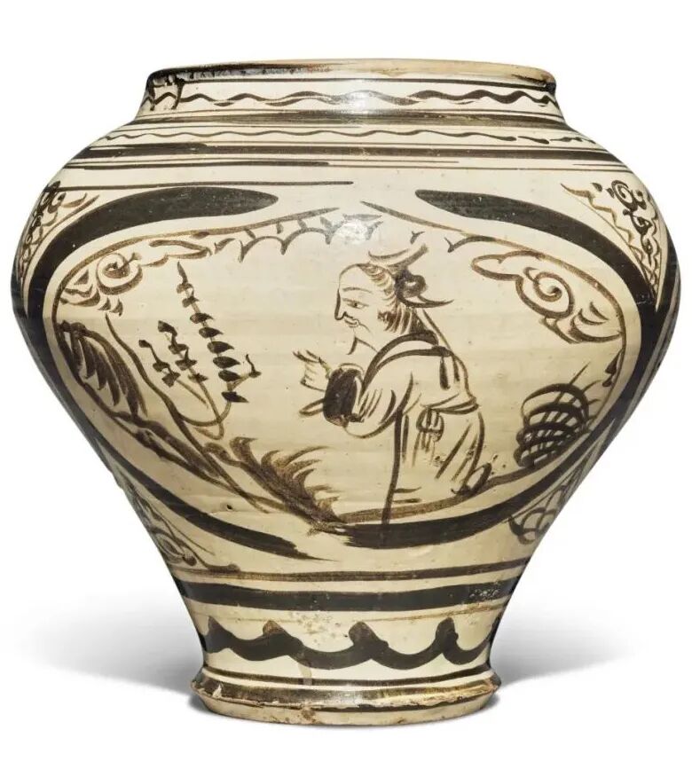 元 磁州窑白地黑花开光人物花鸟图大罐